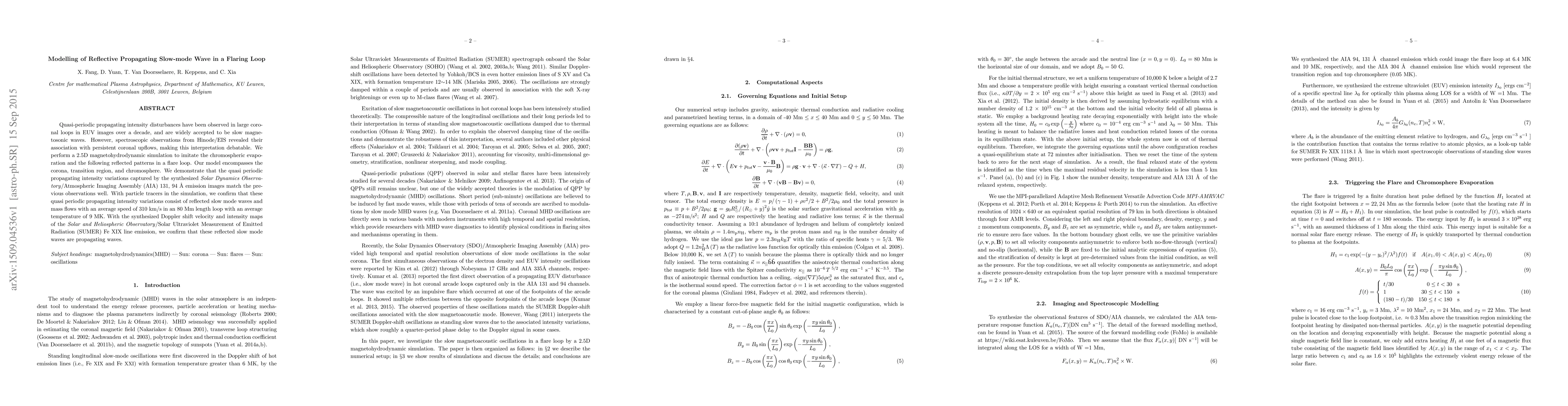 This research uses a 2.5D magnetohydrodynamic simulation to model quasi-periodic intensity disturbances in coronal loops, showing they are reflective slow-mode waves rather than slow magnetosonic waves. The simulation confirms these waves propagate with an average speed of 310 km/s and match observations from Solar Dynamics Observatory and Solar Heliospheric Observatory.
