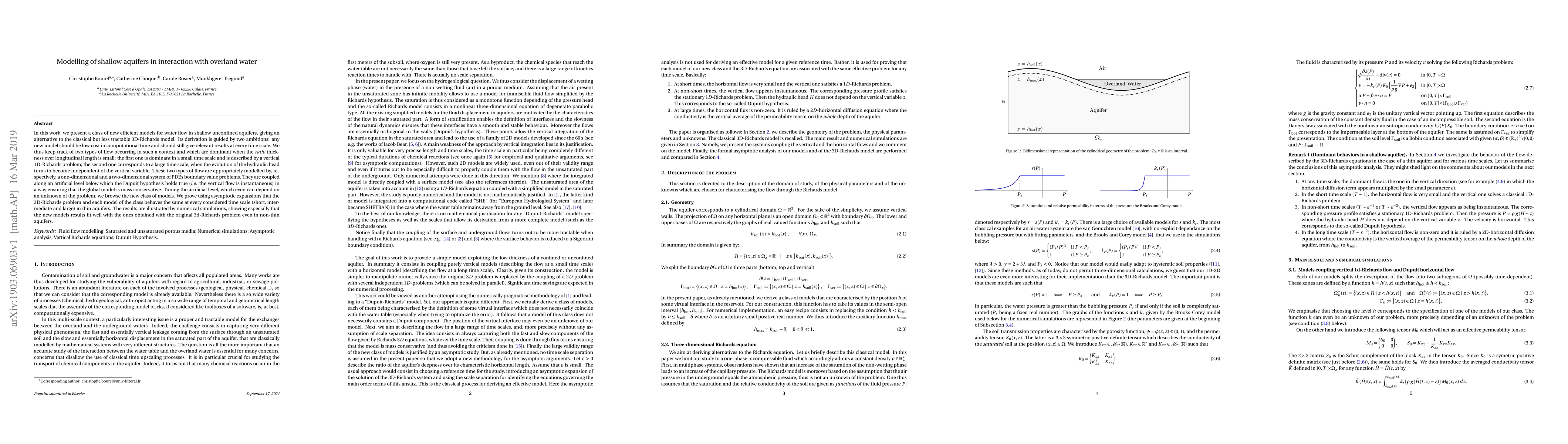 This paper introduces efficient new models for water flow in shallow unconfined aquifers, offering an alternative to the computationally intensive 3D-Richards model. The new models, derived to balance computational efficiency and accuracy, capture two dominant flow types through coupled 1D and 2D PDEs, ensuring mass conservation and proving their equivalence to the 3D-Richards model across different time scales.