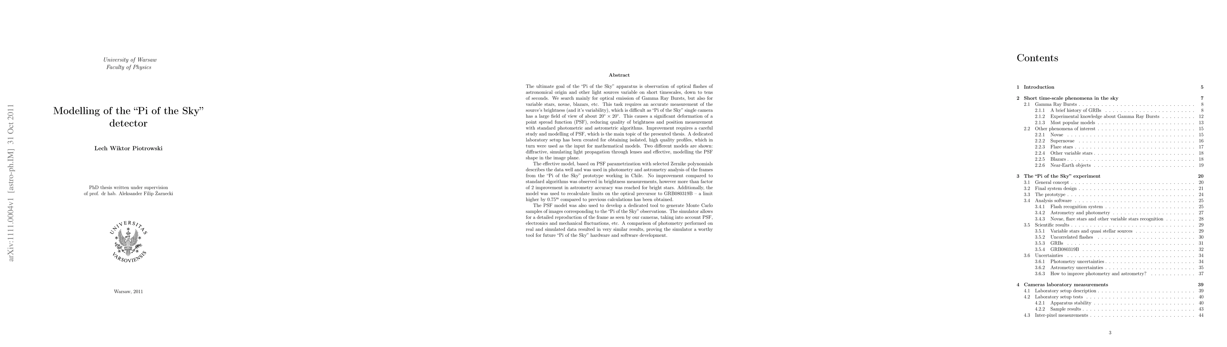 The ultimate goal of the "Pi of the Sky" apparatus is observation of optical flashes of astronomical origin and other light sources variable on short timescales. We search mainly for optical emission of Gamma Ray Bursts, but also for variable stars, novae, etc. This task requires an accurate measurement of the brightness, which is difficult as "Pi of the Sky" single camera has a field of view of about 20*20 deg. This causes a significant deformation of a point spread function (PSF), reducing quality of measurements with standard algorithms. Improvement requires a careful study and modelling of PSF, which is the main topic of the presented thesis. A dedicated laboratory setup has been created for obtaining isolated, high quality profiles, which in turn were used as the input for mathematical models. Two different models are shown: diffractive, simulating light propagation through lenses and effective, modelling the PSF shape in the image plane. The effective model, based on PSF parametrization with selected Zernike polynomials describes the data well and was used in photometry and astrometry analysis. No improvement compared to standard algorithms was observed in photometry, however more than factor of 2 improvement in astrometry accuracy was reached for bright stars. Additionally, the model was used to recalculate limits on the optical precursor to GRB080319B - a limit higher by 0.75 mag compared to previous calculations has been obtained. The PSF model was also used to develop a dedicated tool to generate Monte Carlo samples of images corresponding to the "Pi of the Sky" observations. The simulator allows for a detailed reproduction of the frame as seen by our cameras. A comparison of photometry performed on real and simulated data resulted in very similar results, proving the simulator a worthy tool for future "Pi of the Sky" hardware and software development.