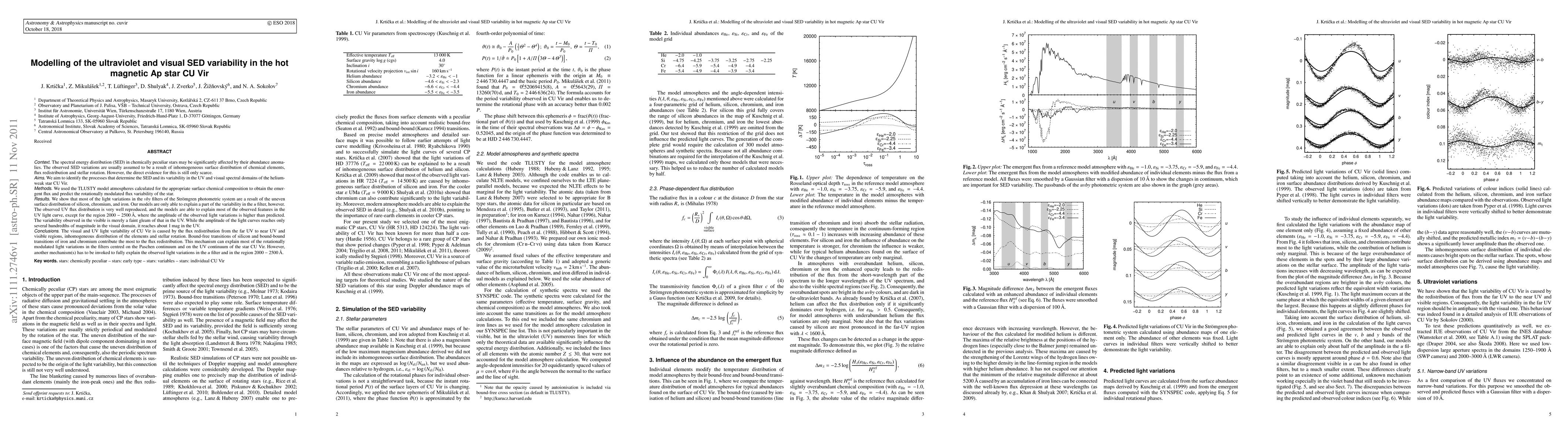 This study models the ultraviolet and visual spectral energy distribution variability in the magnetic Ap star CU Vir, attributing most of the light variations to the uneven surface distribution of silicon, chromium, and iron, and flux redistribution. While the models explain most UV variability, additional mechanisms are needed to account for variations in the u filter and specific UV regions.