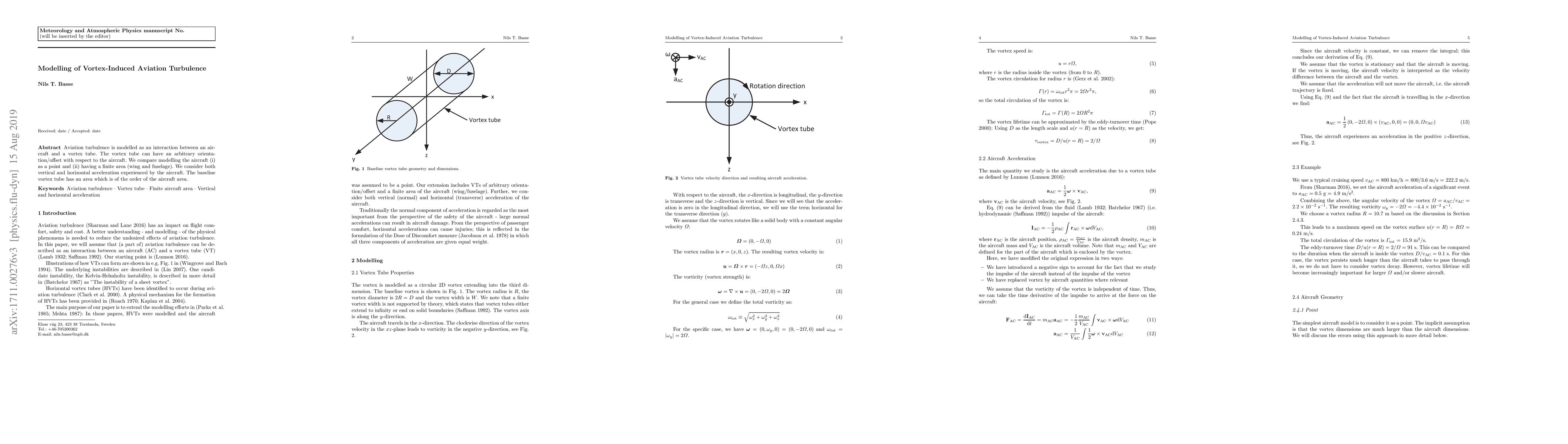 Aviation turbulence is modelled as an interaction between an aircraft and a vortex tube. The vortex tube can have an arbitrary orientation/offset with respect to the aircraft. We compare modelling the aircraft (i) as a point and (ii) having a finite area (wing and fuselage). We consider both vertical and horizontal acceleration experienced by the aircraft. The baseline vortex tube has an area which is of the order of the aircraft area.
