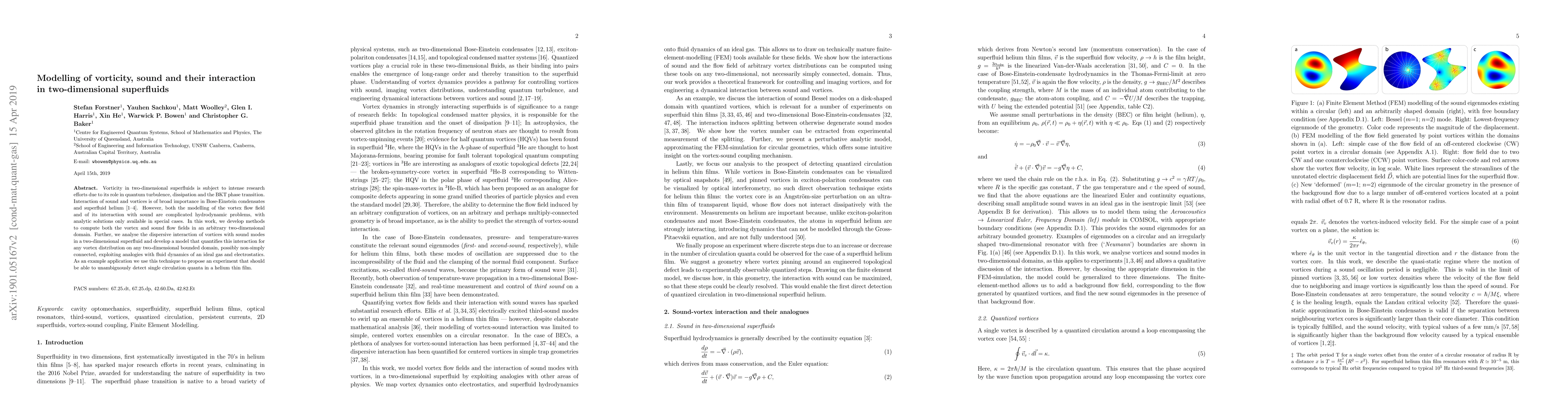 This paper develops methods to model the flow fields of vortices and sound in two-dimensional superfluids, focusing on their interaction. It proposes a model to quantify the dispersive interaction of vortices with sound modes, applicable to any vortex distribution in complex domains, and suggests an experiment to detect single circulation quanta in helium thin films.