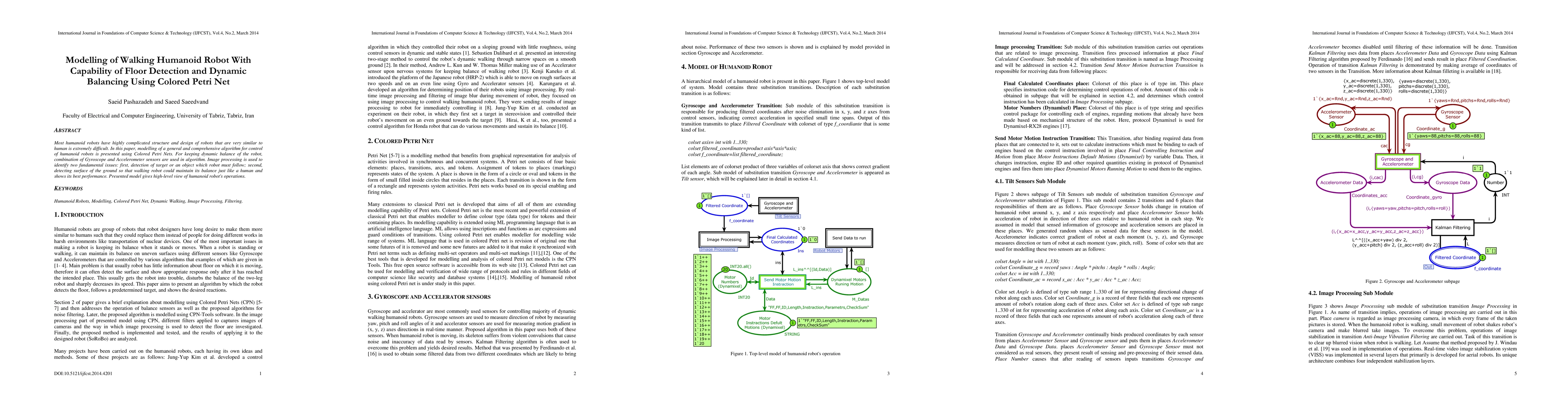 This paper presents a comprehensive algorithm for controlling a humanoid robot using Colored Petri Nets, incorporating gyroscope and accelerometer sensors for dynamic balancing and image processing for target detection and floor surface identification to enhance walking performance. The model provides a high-level overview of the robot's operational capabilities.