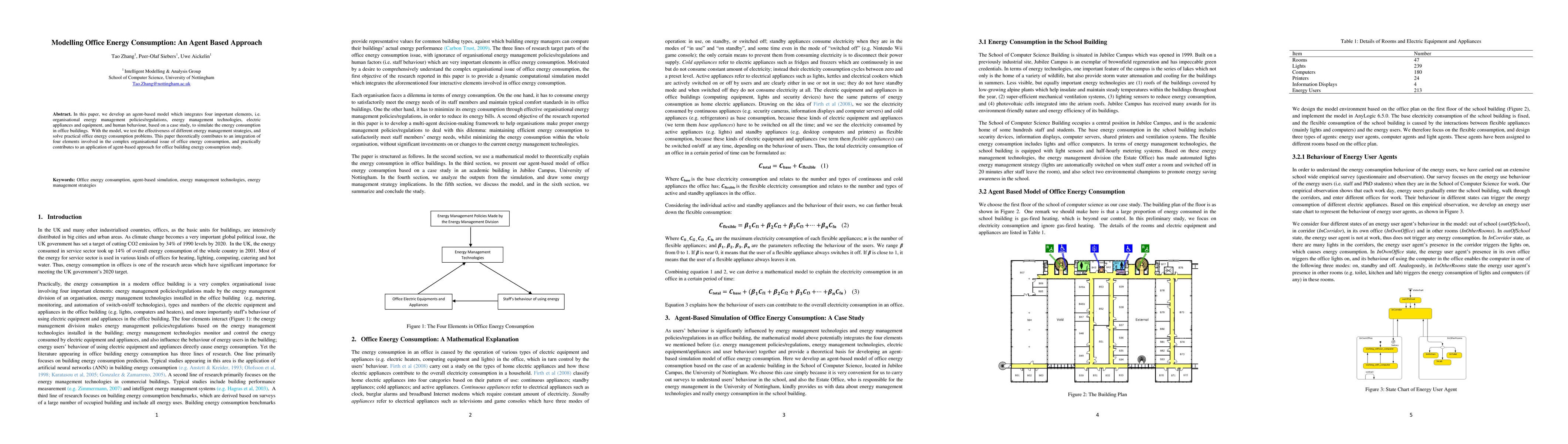 This paper develops an agent-based model integrating organisational policies, technologies, appliances, and human behavior to simulate office energy consumption. It tests various energy management strategies and contributes both theoretically and practically to the study of office energy consumption.