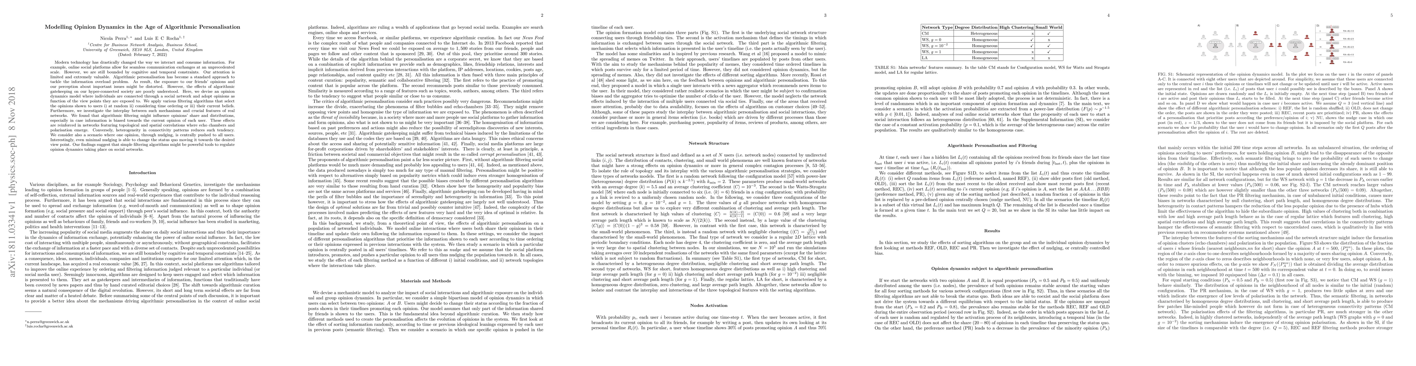 Modern technology has drastically changed the way we interact and consume information. For example, online social platforms allow for seamless communication exchanges at an unprecedented scale. However, we are still bounded by cognitive and temporal constraints. Our attention is limited and extremely valuable. Algorithmic personalisation has become a standard approach to tackle the information overload problem. As result, the exposure to our friends' opinions and our perception about important issues might be distorted. However, the effects of algorithmic gatekeeping on our hyper-connected society are poorly understood. Here, we devise an opinion dynamics model where individuals are connected through a social network and adopt opinions as function of the view points they are exposed to. We apply various filtering algorithms that select the opinions shown to users i) at random ii) considering time ordering or iii) their current beliefs. Furthermore, we investigate the interplay between such mechanisms and crucial features of real networks. We found that algorithmic filtering might influence opinions' share and distributions, especially in case information is biased towards the current opinion of each user. These effects are reinforced in networks featuring topological and spatial correlations where echo chambers and polarisation emerge. Conversely, heterogeneity in connectivity patterns reduces such tendency. We consider also a scenario where one opinion, through nudging, is centrally pushed to all users. Interestingly, even minimal nudging is able to change the status quo moving it towards the desired view point. Our findings suggest that simple filtering algorithms might be powerful tools to regulate opinion dynamics taking place on social networks