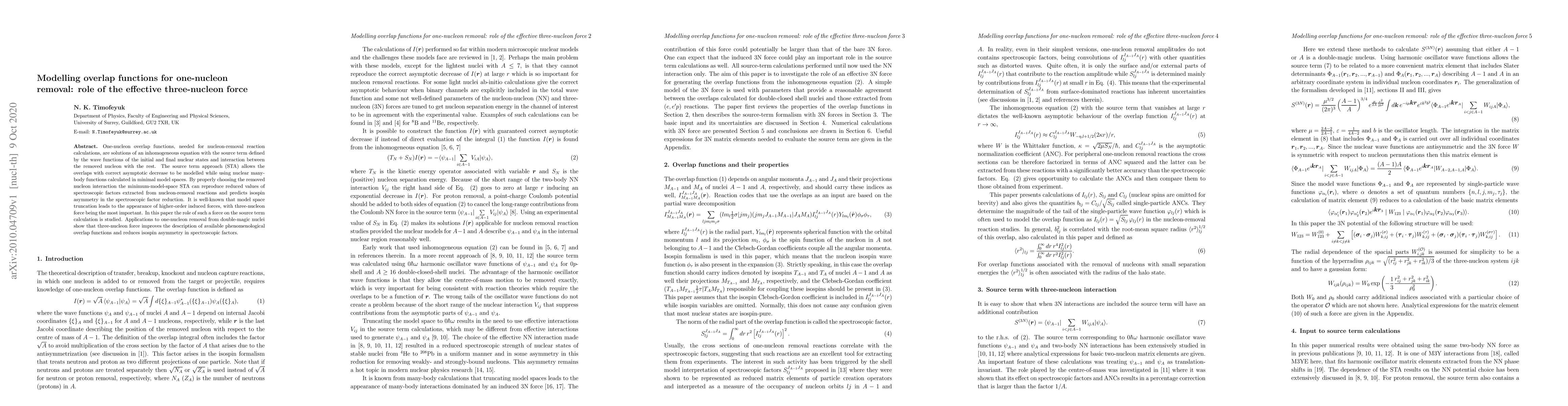 One-nucleon overlap functions, needed for nucleon-removal reaction calculations, are solutions of an inhomogeneous equation with the source term defined by the wave functions of the initial and final nuclear states and interaction between the removed nucleon with the rest. The source term approach (STA) allows the overlaps with correct asymptotic decrease to be modelled while using nuclear many-body functions calculated in minimal model spaces. By properly choosing the removed nucleon interaction the minimum-model-space STA can reproduce reduced values of spectroscopic factors extracted from nucleon-removal reactions and predicts isospin asymmetry in the spectroscopic factor reduction. It is well-known that model space truncation leads to the appearance of higher-order induced forces, with three-nucleon force being the most important. In this paper the role of such a force on the source term calculation is studied. Applications to one-nucleon removal from double-magic nuclei show that three-nucleon force improves the description of available phenomenological overlap functions and reduces isospin asymmetry in spectroscopic factors.