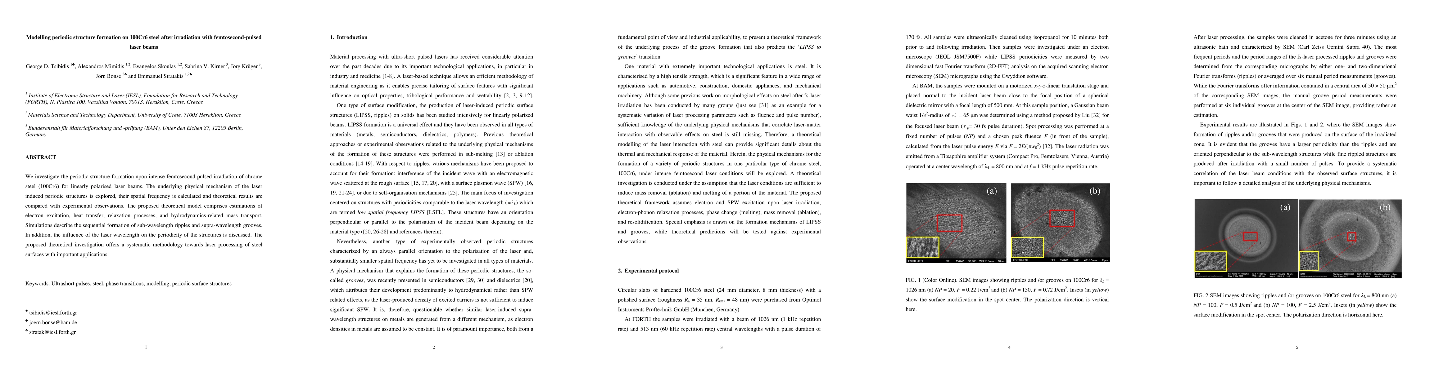 This paper investigates the formation of periodic structures on 100Cr6 steel via intense femtosecond-pulsed laser irradiation, exploring the underlying physical mechanisms and comparing theoretical models with experimental data. The study proposes a comprehensive theoretical framework to understand electron excitation, heat transfer, and mass transport processes, highlighting the influence of laser wavelength on the periodicity of the resulting structures.
