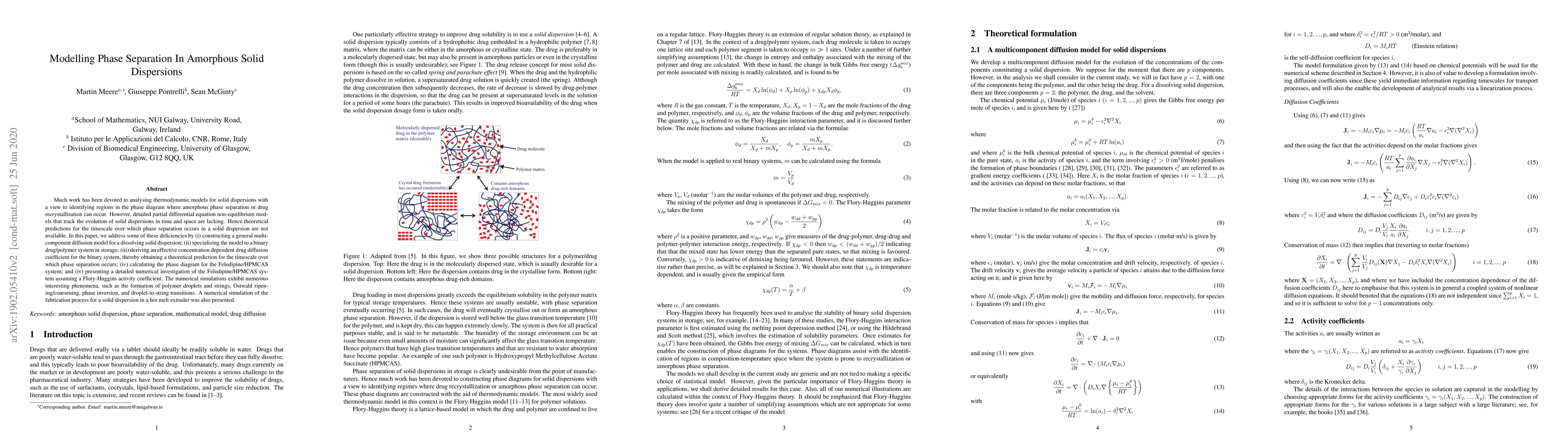 Much work has been devoted to analysing thermodynamic models for solid dispersions with a view to identifying regions in the phase diagram where amorphous phase separation or drug recrystallization can occur. However, detailed partial differential equation non-equilibrium models that track the evolution of solid dispersions in time and space are lacking. Hence theoretical predictions for the timescale over which phase separation occurs in a solid dispersion are not available. In this paper, we address some of these deficiencies by (i) constructing a general multicomponent diffusion model for a dissolving solid dispersion; (ii) specializing the model to a binary drug/polymer system in storage; (iii) deriving an effective concentration dependent drug diffusion coefficient for the binary system, thereby obtaining a theoretical prediction for the timescale over which phase separation occurs; and (iv) presenting a detailed numerical investigation of the HPMCAS/Felodipine system assuming a Flory-Huggins activity coefficient. The numerical simulations exhibit numerous interesting phenomena, such as the formation of polymer droplets and strings, Ostwald ripening/coarsening, phase inversion, and droplet-to-string transitions.