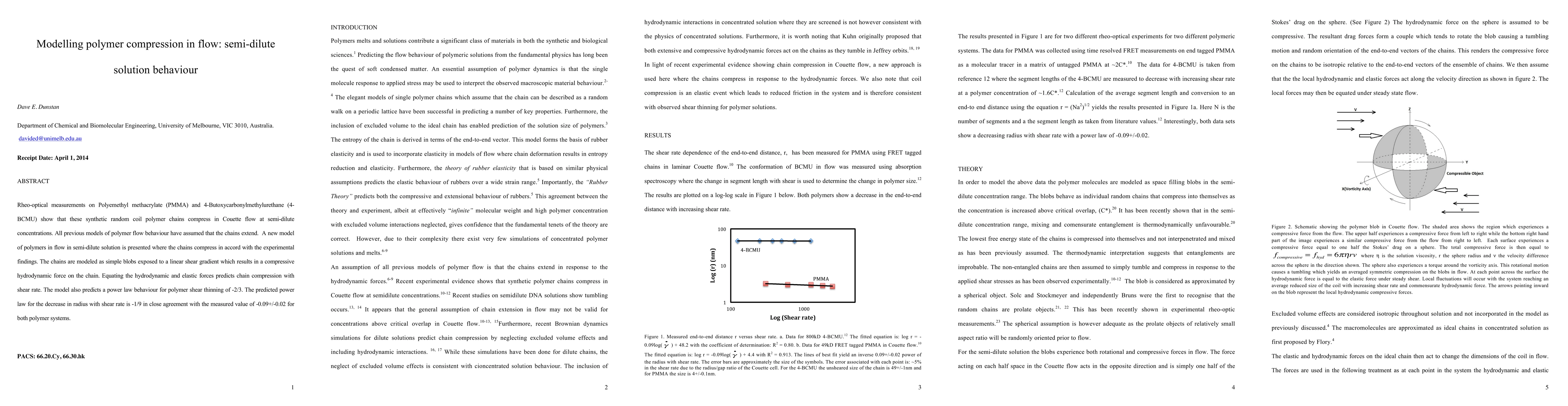 This paper presents a new model for polymer compression in semi-dilute solution under Couette flow, contrasting with previous models that assumed polymer chain extension. The model predicts polymer shear thinning and chain compression in line with experimental observations for PMMA and 4-BCMU.