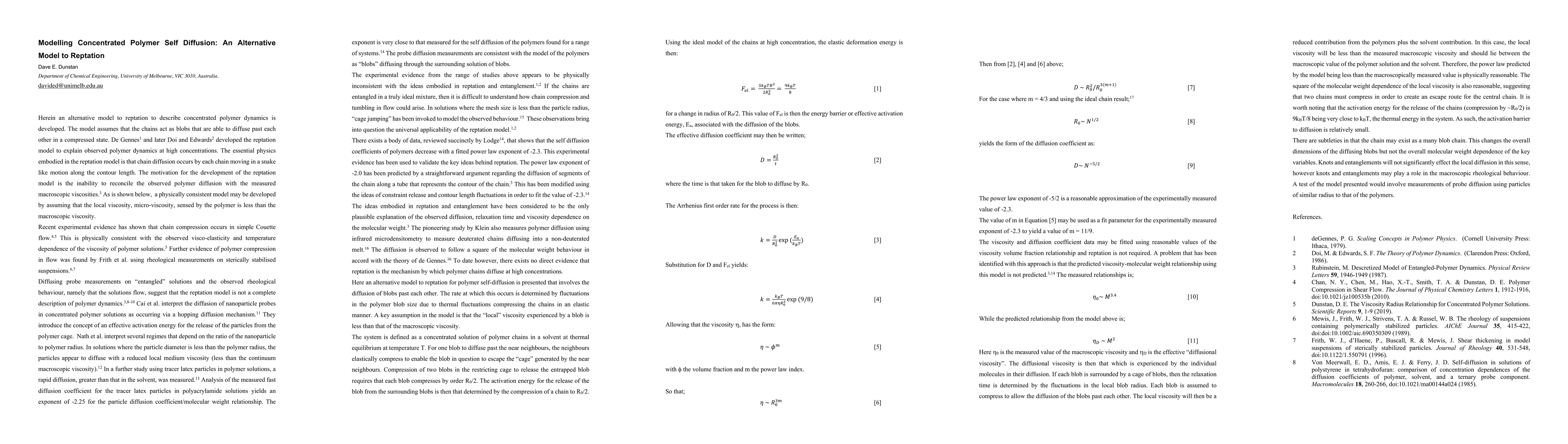 Herein an alternative model to reptation to describe concentrated polymer dynamics is developed. The model assumes that the chains act as blobs that are able to diffuse past each other in a compressed state. Allowing that the local viscosity experienced by a blob is less than the macroscopic viscosity allows the viscosity-molecular weight and diffusion coefficient-molecular weight relationships to be determined.