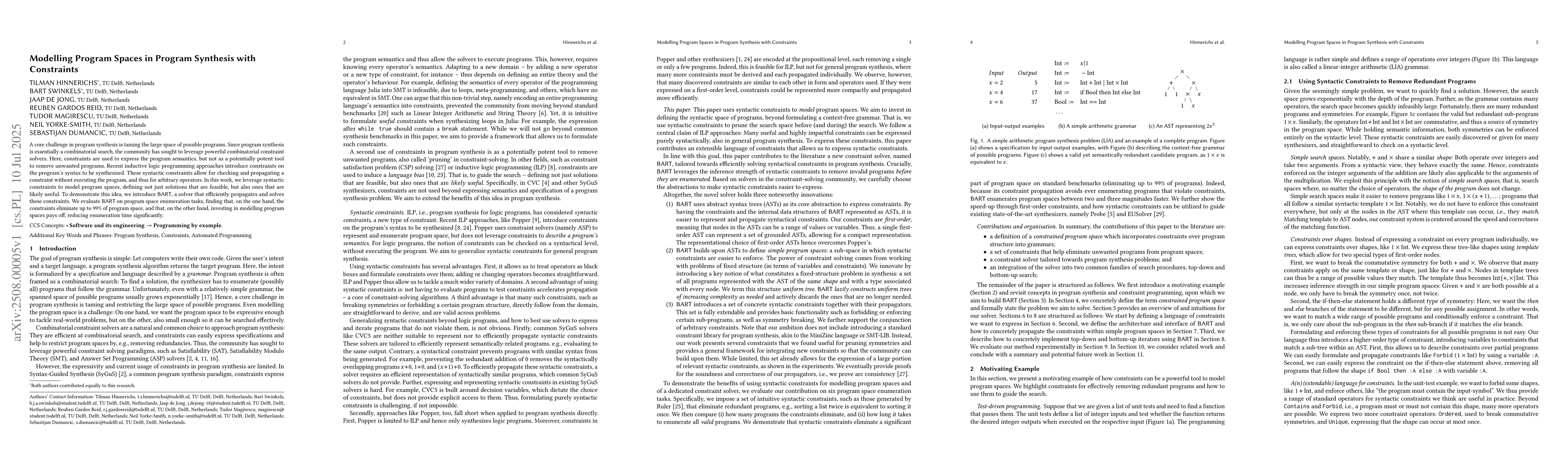 A core challenge in program synthesis is taming the large space of possible programs. Since program synthesis is essentially a combinatorial search, the community has sought to leverage powerful combinatorial constraint solvers. Here, constraints are used to express the program semantics, but not as a potentially potent tool to remove unwanted programs. Recent inductive logic programming approaches introduce constraints on the program's syntax to be synthesized. These syntactic constraints allow for checking and propagating a constraint without executing the program, and thus for arbitrary operators. In this work, we leverage syntactic constraints to model program spaces, defining not just solutions that are feasible, but also ones that are likely useful. To demonstrate this idea, we introduce BART, a solver that efficiently propagates and solves these constraints. We evaluate BART on program space enumeration tasks, finding that the constraints eliminate up to 99 percent of the program space, and that modeling program spaces significantly reduces enumeration time.