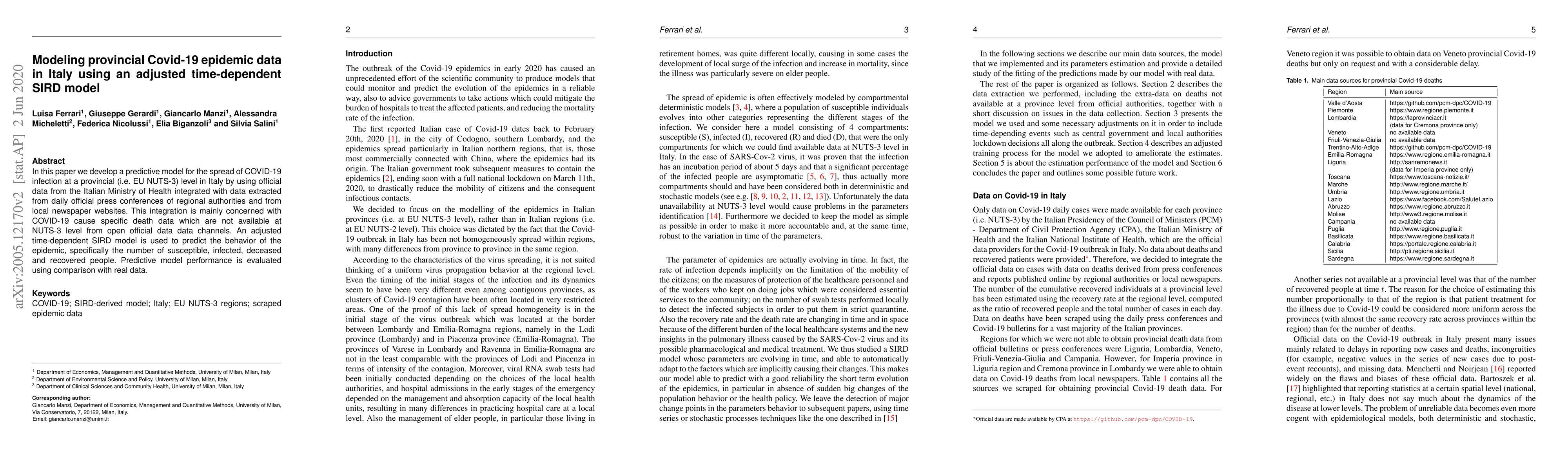 In this paper we develop a predictive model for the spread of COVID-19 infection at a provincial (i.e. EU NUTS-3) level in Italy by using official data from the Italian Ministry of Health integrated with data extracted from daily official press conferences of regional authorities and from local newspaper websites. This integration is mainly concerned with COVID-19 cause specific death data which are not available at NUTS-3 level from open official data data channels. An adjusted time-dependent SIRD model is used to predict the behavior of the epidemic, specifically the number of susceptible, infected, deceased and recovered people. Predictive model performance is evaluated using comparison with real data.