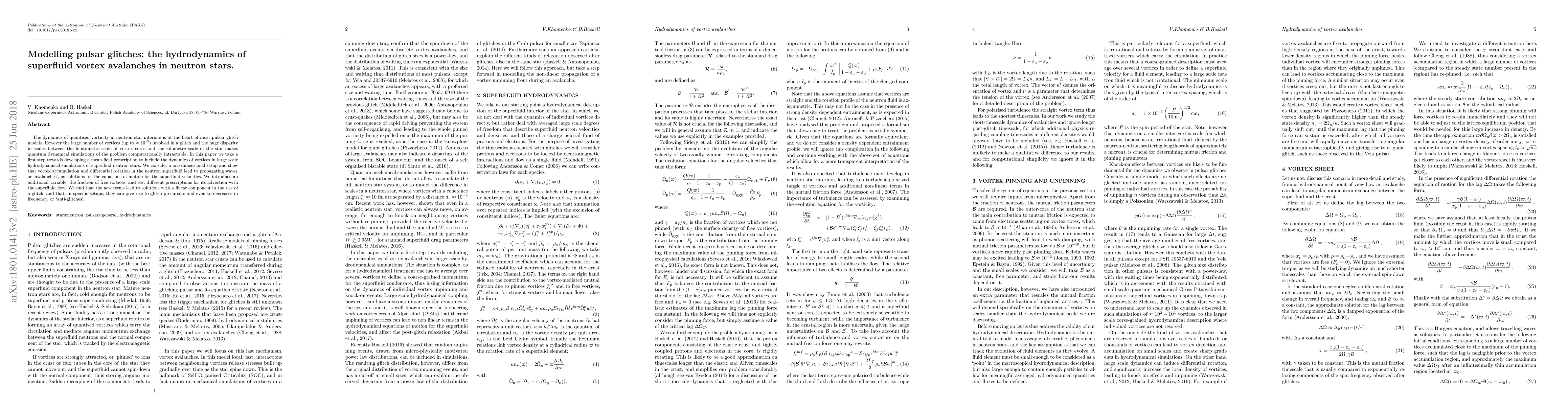 This paper develops a mean field model to simulate superfluid vortex dynamics in neutron stars, focusing on the hydrodynamics of vortex avalanches. The model introduces a fraction of free vortices to capture the effects of vortex accumulation and differential rotation, leading to glitch precursors and potential anti-glitches.