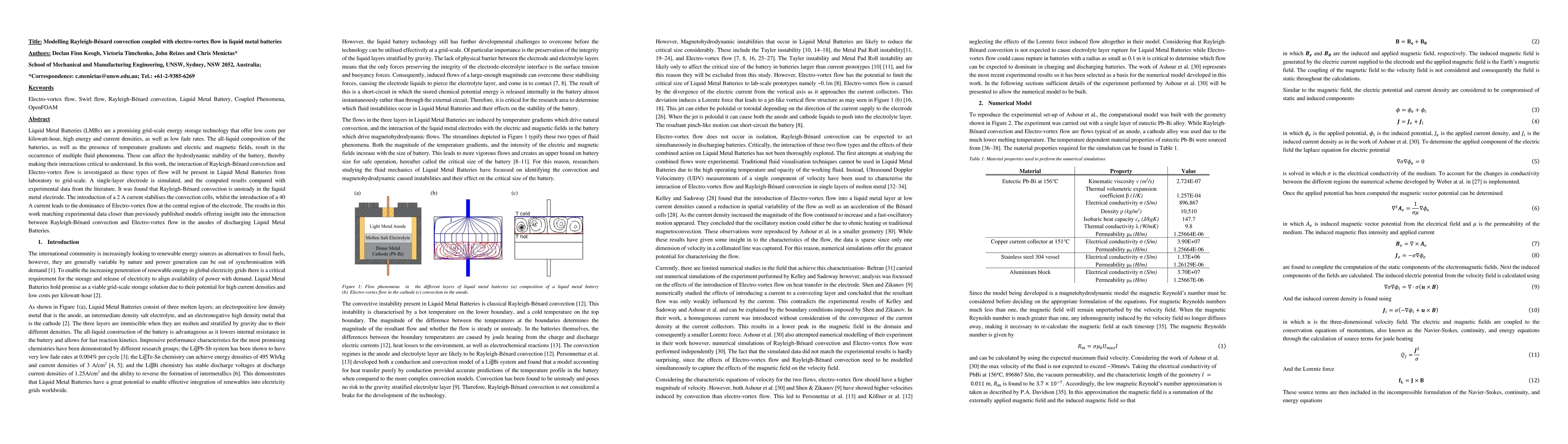 Liquid Metal Batteries (LMBs) are a promising grid-scale energy storage technology that offer low costs per kilowatt-hour, high energy and current densities, as well as low fade rates. The all-liquid composition of the batteries, as well as the presence of temperature gradients and electric and magnetic fields, result in the occurrence of multiple fluid phenomena. These can affect the hydrodynamic stability of the battery, thereby making their interactions critical to understand. In this work, the interaction of Rayleigh-B\'enard convection and Electro-vortex flow is investigated as these types of flow will be present in Liquid Metal Batteries from laboratory to grid-scale. A single-layer electrode is simulated, and the computed results compared with experimental data from the literature. It was found that Rayleigh-B\'enard convection is unsteady in the liquid metal electrode. The introduction of a 2 A current stabilises the convection cells, whilst the introduction of a 40 A current leads to the dominance of Electro-vortex flow at the central region of the electrode. The results in this work matching experimental data closer than previously published models offering insight into the interaction between Rayleigh-B\'enard convection and Electro-vortex flow in the anodes of discharging Liquid Metal Batteries.