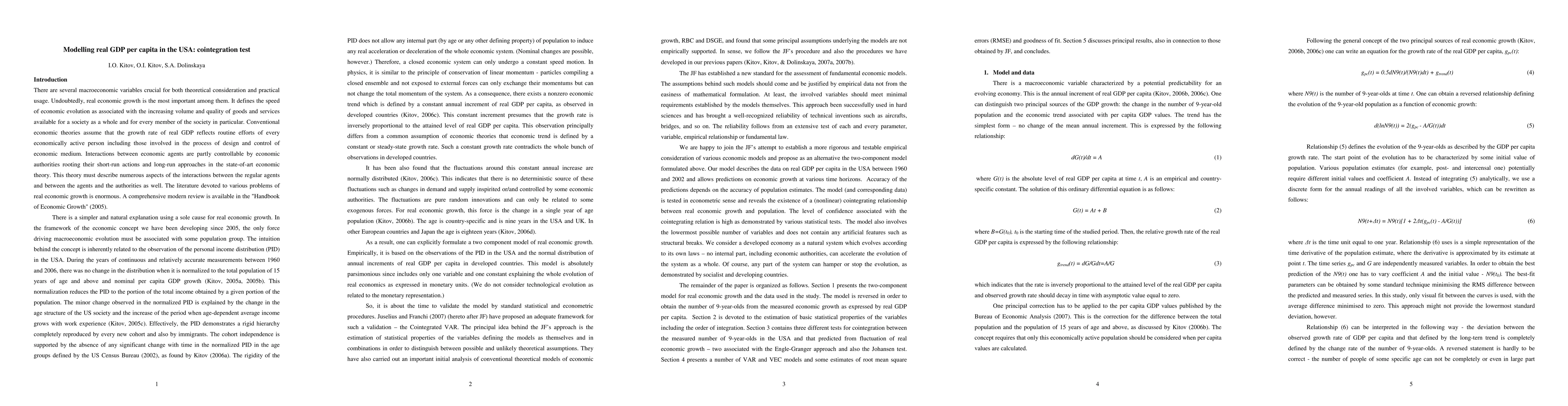 This paper presents a two-component model for real GDP per capita in the USA, showing a cointegrating relationship between GDP growth and the number of 9-year-olds. Cointegration tests confirm a strong link, with the highest R² and lowest RMSE in the VAR model.