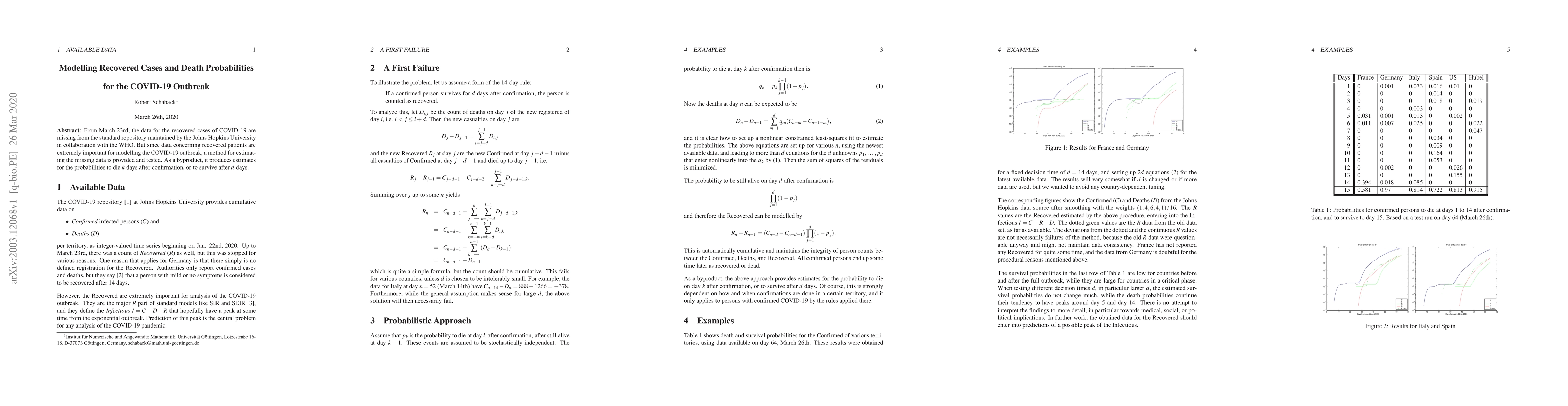 From March 23rd, the data for the recovered cases of COVID-19 are missing from the standard repository maintained by the Johns Hopkins University in collaboration with the WHO. But since data concerning recovered patients are extremely important for modelling the COVID-19 outbreak, a method for estimating the missing data is provided and tested. As a byproduct, it produces estimates for the probabilities to die $k$ days after confirmation, or to survive after $d$ days.
