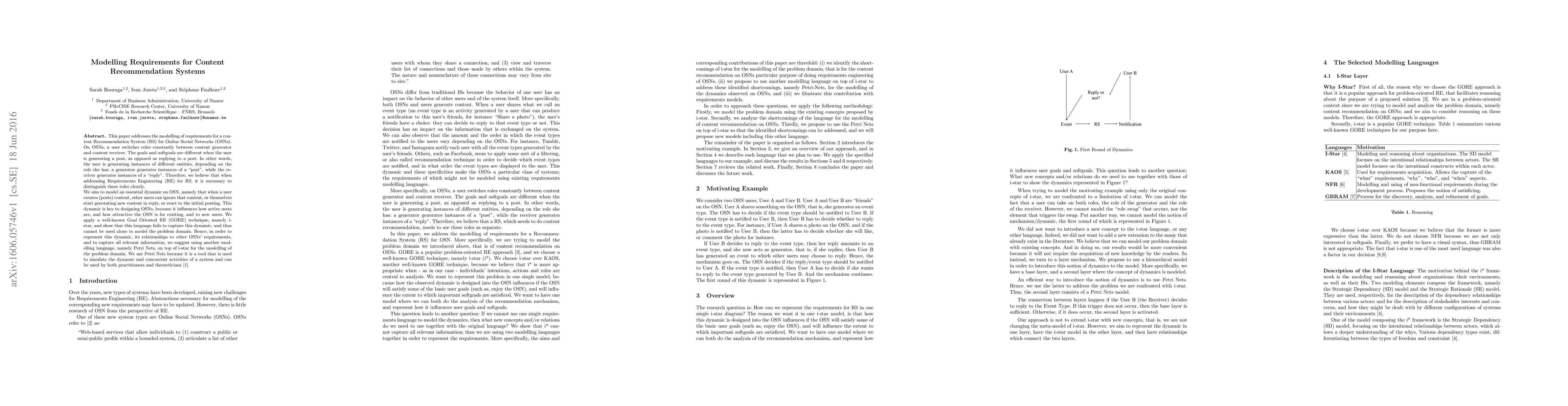 This paper addresses the modelling of requirements for a content Recommendation System (RS) for Online Social Networks (OSNs). On OSNs, a user switches roles constantly between content generator and content receiver. The goals and softgoals are different when the user is generating a post, as opposed as replying to a post. In other words, the user is generating instances of different entities, depending on the role she has: a generator generates instances of a "post", while the receiver generates instances of a "reply". Therefore, we believe that when addressing Requirements Engineering (RE) for RS, it is necessary to distinguish these roles clearly. We aim to model an essential dynamic on OSN, namely that when a user creates (posts) content, other users can ignore that content, or themselves start generating new content in reply, or react to the initial posting. This dynamic is key to designing OSNs, because it influences how active users are, and how attractive the OSN is for existing, and to new users. We apply a well-known Goal Oriented RE (GORE) technique, namely i-star, and show that this language fails to capture this dynamic, and thus cannot be used alone to model the problem domain. Hence, in order to represent this dynamic, its relationships to other OSNs' requirements, and to capture all relevant information, we suggest using another modelling language, namely Petri Nets, on top of i-star for the modelling of the problem domain. We use Petri Nets because it is a tool that is used to simulate the dynamic and concurrent activities of a system and can be used by both practitioners and theoreticians.