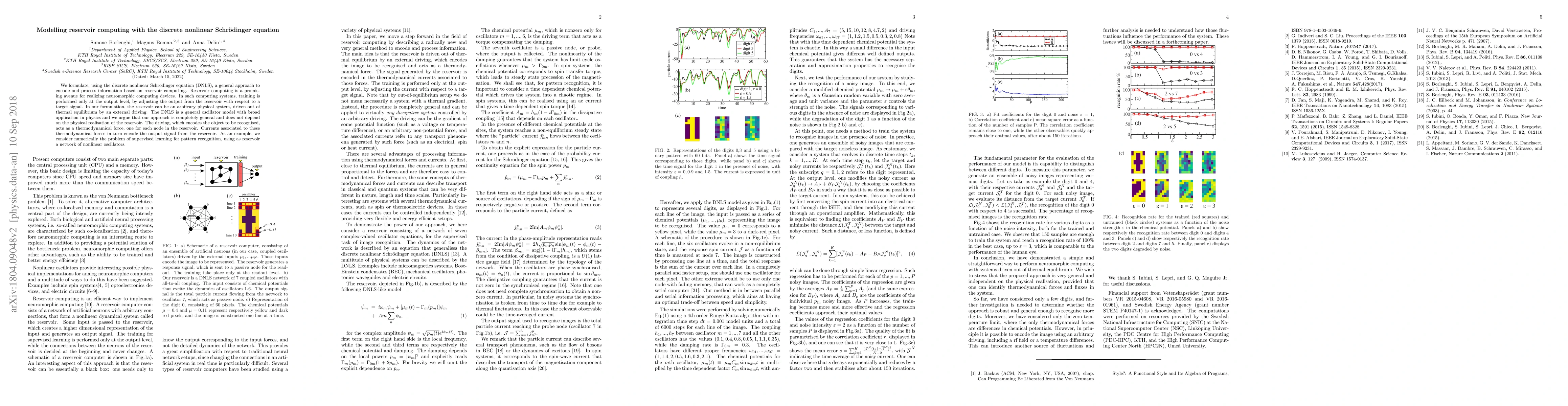 We formulate, using the discrete nonlinear Schroedinger equation (DNLS), a general approach to encode and process information based on reservoir computing. Reservoir computing is a promising avenue for realizing neuromorphic computing devices. In such computing systems, training is performed only at the output level, by adjusting the output from the reservoir with respect to a target signal. In our formulation, the reservoir can be an arbitrary physical system, driven out of thermal equilibrium by an external driving. The DNLS is a general oscillator model with broad application in physics and we argue that our approach is completely general and does not depend on the physical realisation of the reservoir. The driving, which encodes the object to be recognised, acts as a thermodynamical force, one for each node in the reservoir. Currents associated to these thermodynamical forces in turn encode the output signal from the reservoir. As an example, we consider numerically the problem of supervised learning for pattern recognition, using as reservoir a network of nonlinear oscillators.