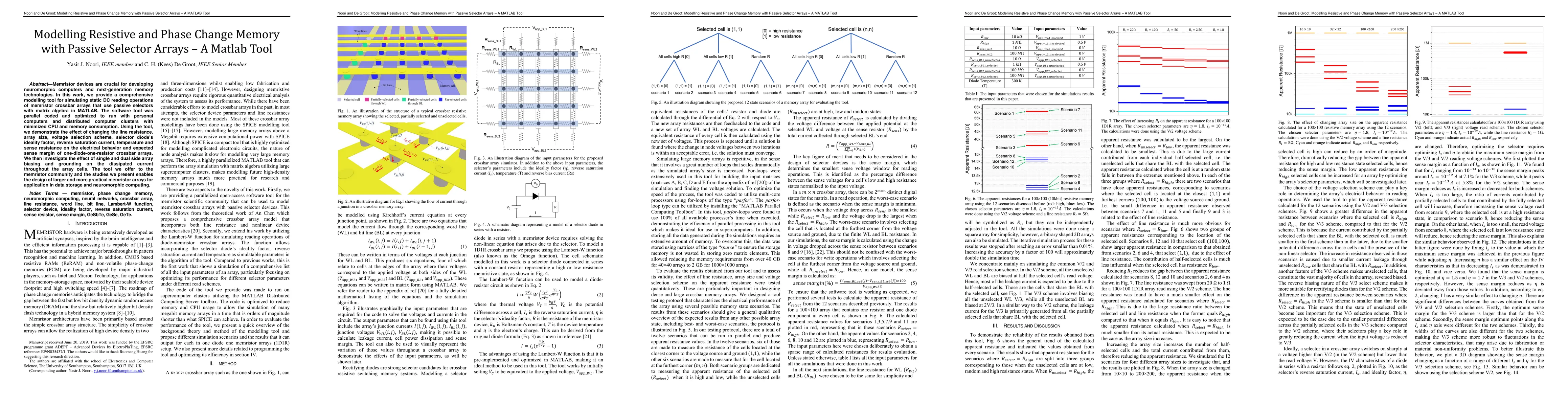 This paper presents a MATLAB tool for simulating resistive and phase change memory arrays using passive selectors, focusing on static DC operations. The tool optimizes performance for personal computers and clusters, enabling analysis of various factors affecting memristor crossbar arrays, which aids in designing more practical memory technologies for data storage and neuromorphic computing.