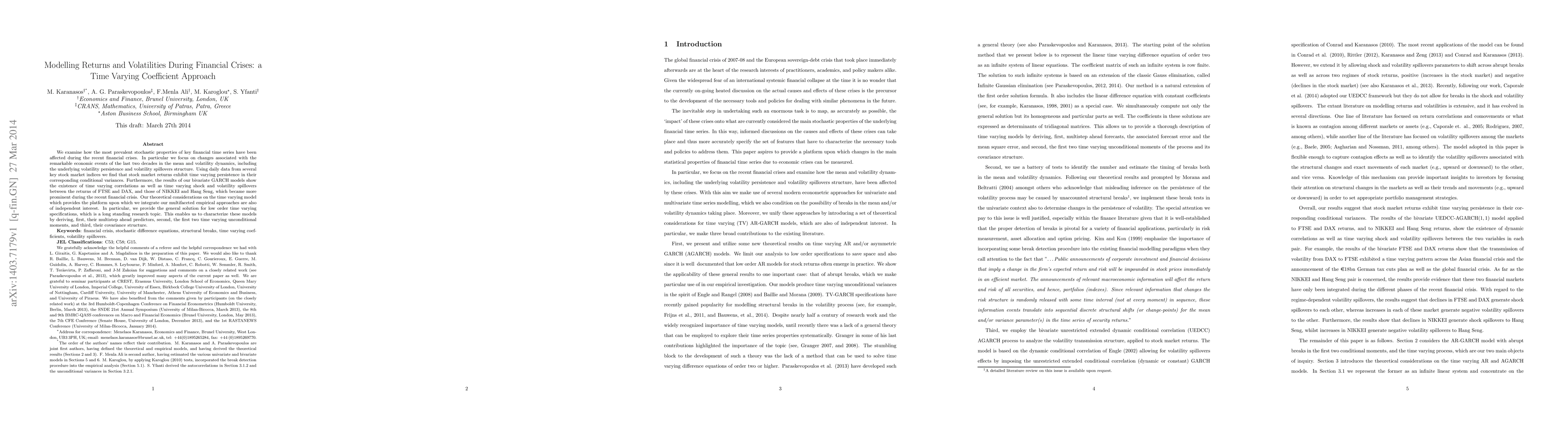 We examine how the most prevalent stochastic properties of key financial time series have been affected during the recent financial crises. In particular we focus on changes associated with the remarkable economic events of the last two decades in the mean and volatility dynamics, including the underlying volatility persistence and volatility spillovers structure. Using daily data from several key stock market indices we find that stock market returns exhibit time varying persistence in their corresponding conditional variances. Furthermore, the results of our bivariate GARCH models show the existence of time varying correlations as well as time varying shock and volatility spillovers between the returns of FTSE and DAX, and those of NIKKEI and Hang Seng, which became more prominent during the recent financial crisis. Our theoretical considerations on the time varying model which provides the platform upon which we integrate our multifaceted empirical approaches are also of independent interest. In particular, we provide the general solution for low order time varying specifications, which is a long standing research topic. This enables us to characterize these models by deriving, first, their multistep ahead predictors, second, the first two time varying unconditional moments, and third, their covariance structure.