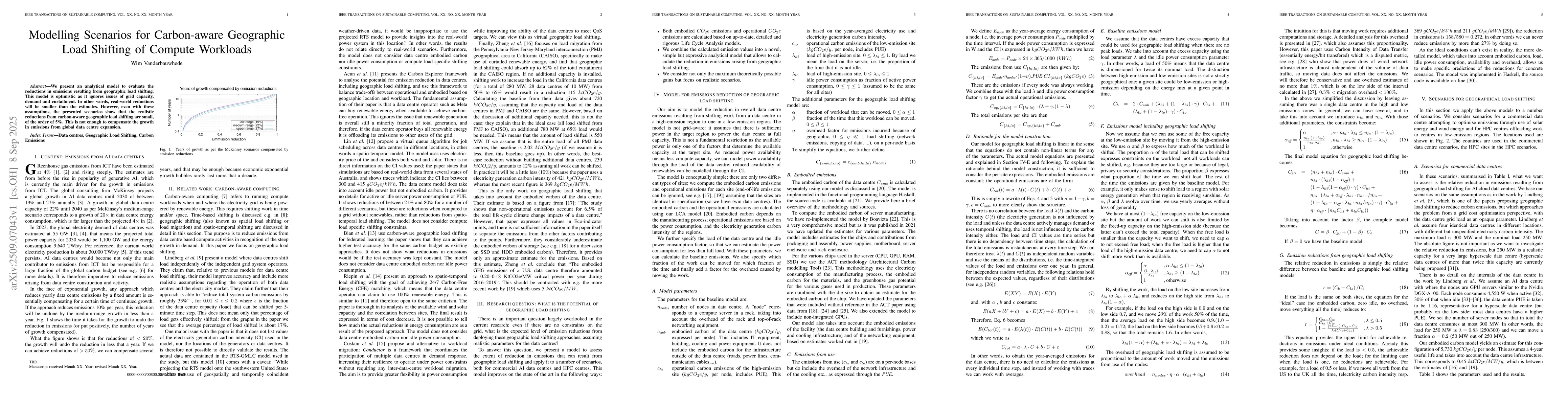 We present an analytical model to evaluate the reductions in emissions resulting from geographic load shifting. This model is optimistic as it ignores issues of grid capacity, demand and curtailment. In other words, real-world reductions will be smaller than the estimates. However, even with these assumptions, the presented scenarios show that the realistic reductions from carbon-aware geographic load shifting are small, of the order of 5\%. This is not enough to compensate the growth in emissions from global data centre expansion.