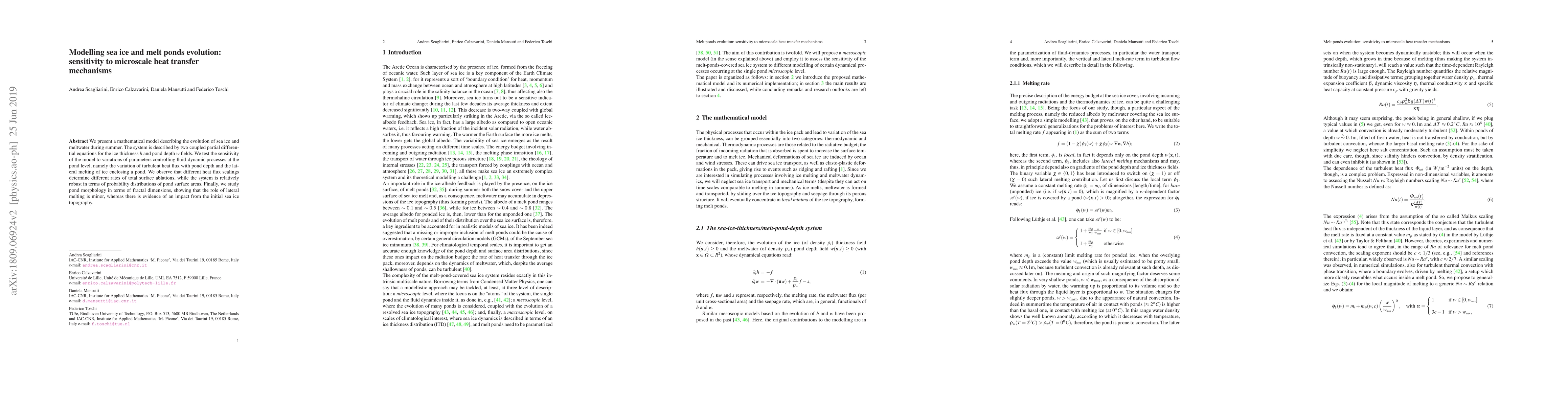 We present a mathematical model describing the evolution of sea ice and meltwater during summer. The system is described by two coupled partial differential equations for the ice thickness $h$ and pond depth $w$ fields. We test the sensitivity of the model to variations of parameters controlling fluid-dynamic processes at the pond level, namely the variation of turbulent heat flux with pond depth and the lateral melting of ice enclosing a pond. We observe that different heat flux scalings determine different rates of total surface ablations, while the system is relatively robust in terms of probability distributions of pond surface areas. Finally, we study pond morphology in terms of fractal dimensions, showing that the role of lateral melting is minor, whereas there is evidence of an impact from the initial sea ice topography.