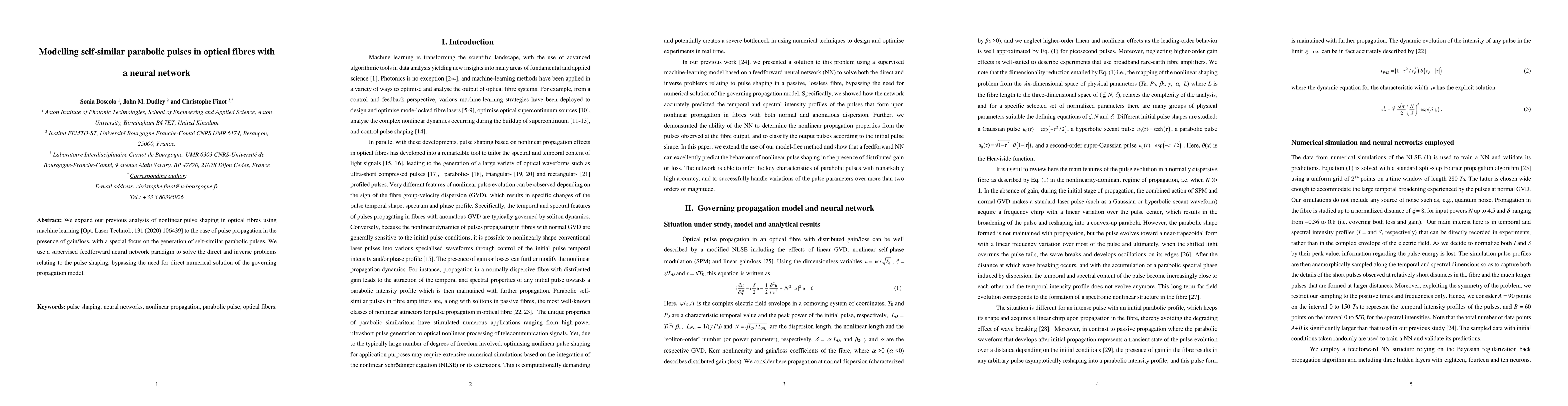 This paper employs a supervised feedforward neural network to model the propagation of self-similar parabolic pulses in optical fibres, focusing on scenarios with gain/loss, and avoids direct numerical solutions of the governing propagation model. The neural network addresses both direct and inverse pulse shaping problems.