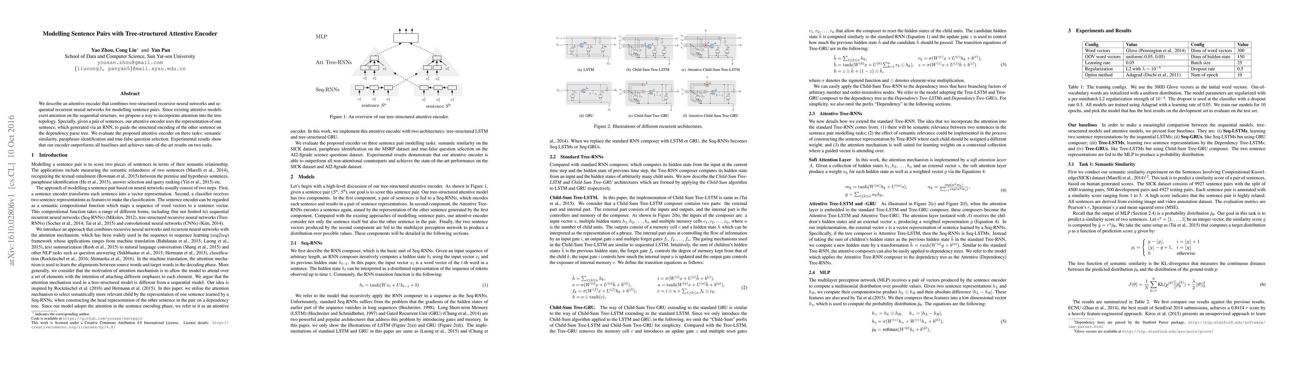 This paper proposes an attentive encoder that merges tree-structured recursive neural networks with sequential RNNs to model sentence pairs, focusing on attention within the tree topology. The model outperforms baselines on semantic similarity, paraphrase identification, and true-false question selection tasks.