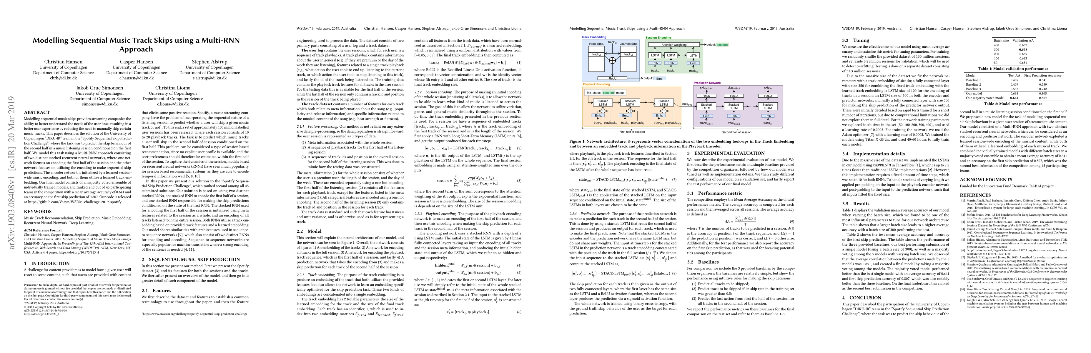 Modelling sequential music skips provides streaming companies the ability to better understand the needs of the user base, resulting in a better user experience by reducing the need to manually skip certain music tracks. This paper describes the solution of the University of Copenhagen DIKU-IR team in the 'Spotify Sequential Skip Prediction Challenge', where the task was to predict the skip behaviour of the second half in a music listening session conditioned on the first half. We model this task using a Multi-RNN approach consisting of two distinct stacked recurrent neural networks, where one network focuses on encoding the first half of the session and the other network focuses on utilizing the encoding to make sequential skip predictions. The encoder network is initialized by a learned session-wide music encoding, and both of them utilize a learned track embedding. Our final model consists of a majority voted ensemble of individually trained models, and ranked 2nd out of 45 participating teams in the competition with a mean average accuracy of 0.641 and an accuracy on the first skip prediction of 0.807. Our code is released at https://github.com/Varyn/WSDM-challenge-2019-spotify.