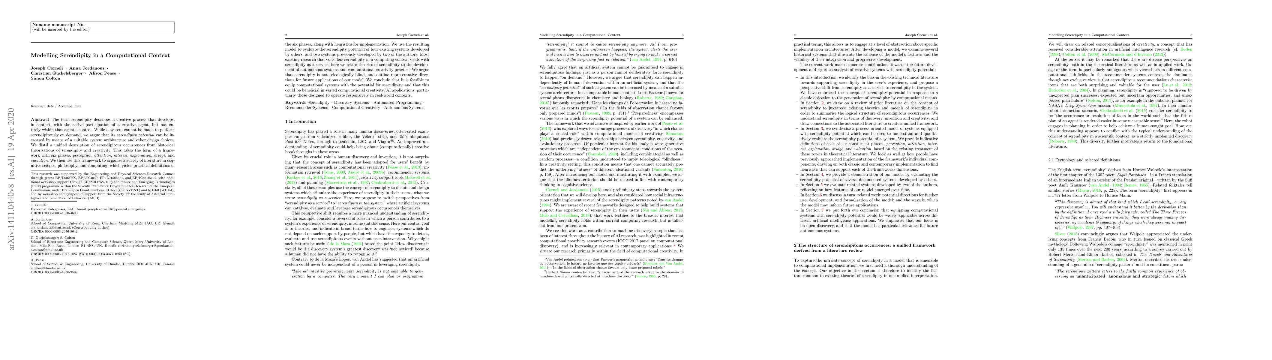 This paper proposes a framework for modelling serendipity in computational systems, consisting of six phases: perception, attention, interest, explanation, bridge, and valuation. It evaluates the serendipity potential of existing systems and argues that computational systems can be designed to enhance serendipity, which could be beneficial in applications of computational creativity and AI.