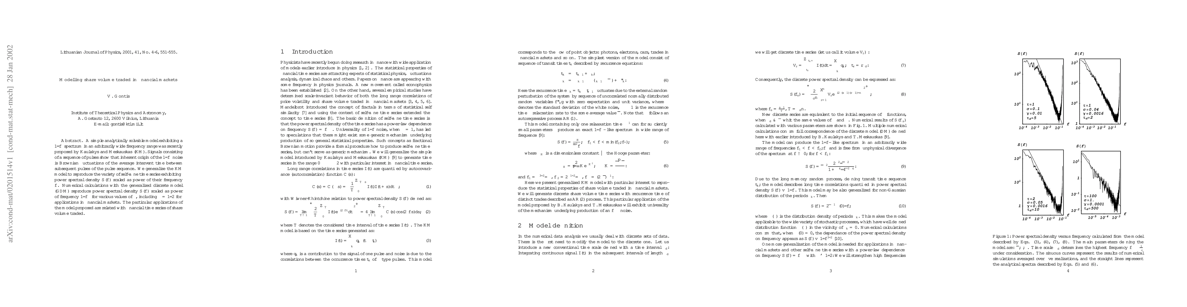 A new model replicates 1/f noise in financial markets, where self-affine time series exhibit power spectral density scaled as a power of frequency. It successfully reproduces the behavior for share volume traded data.