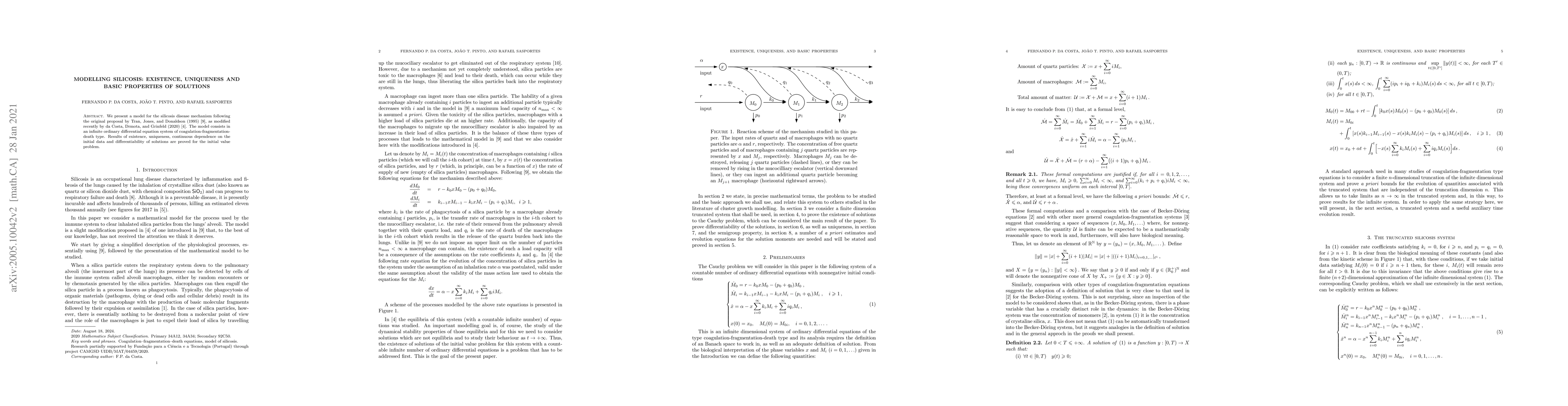 We present a model for the silicosis disease mechanism following the original proposal by Tran, Jones, and Donaldson (1995) [9], as modified recently by da Costa, Drmota, and Grinfeld (2020) [4]. The model consists in an infinite ordinary differential equation system of coagulation-fragmentation-death type. Results of existence, uniqueness, continuous dependence on the initial data and differentiability of solutions are proved for the initial value problem.