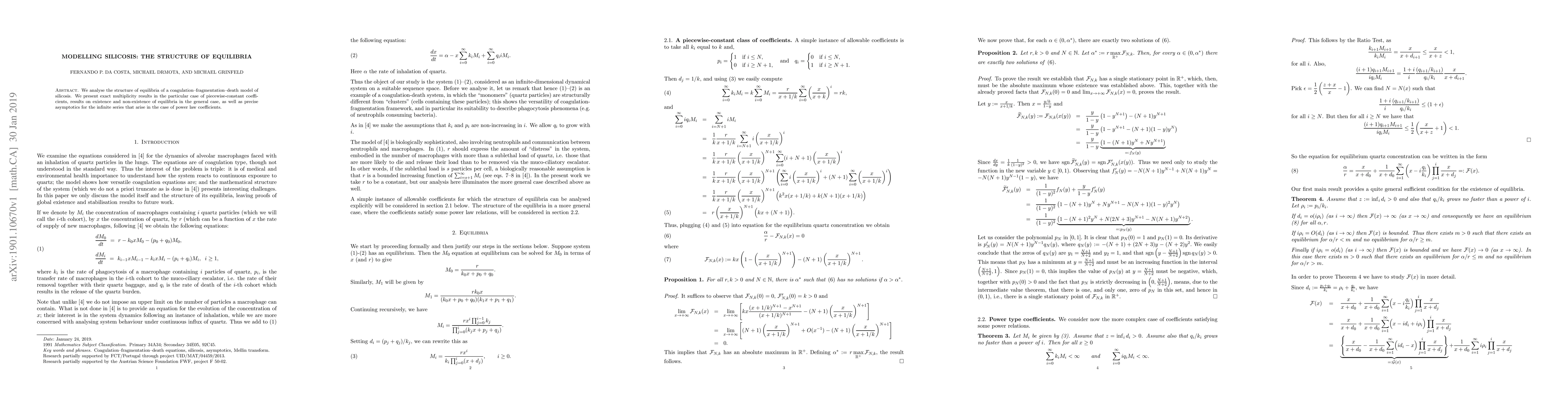 We analyse the structure of equilibria of a coagulation-fragmentation-death model of silicosis. We present exact multiplicity results in the particular case of piecewise-constant coefficients, results on existence and non-existence of equilibria in the general case, as well as precise asymptotics for the infinite series that arise in the case of power law coefficients.