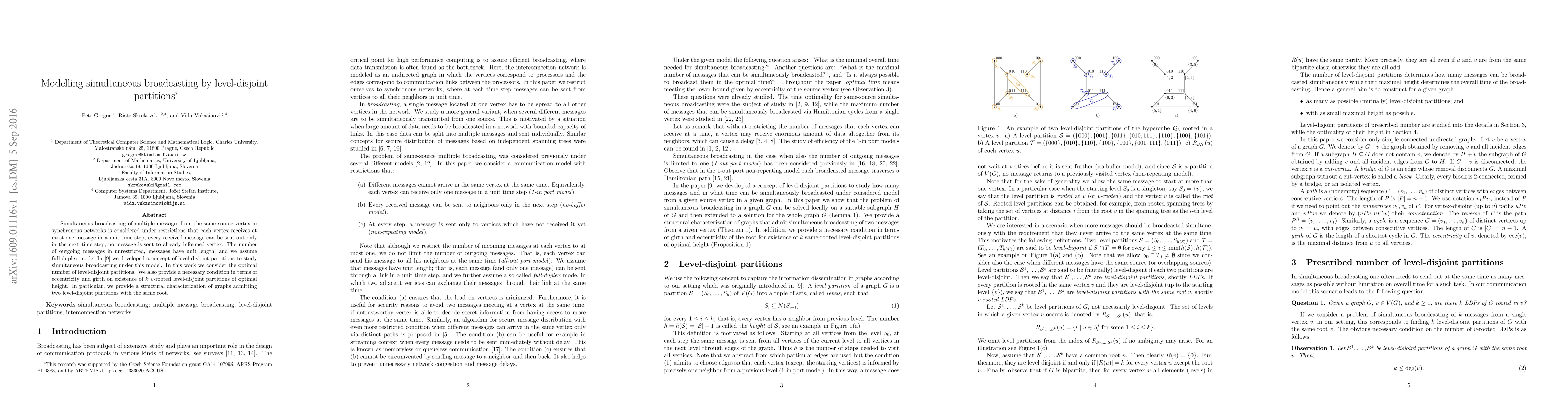 This paper investigates optimal simultaneous broadcasting in synchronous networks using level-disjoint partitions, focusing on the conditions for the existence of $k$ $v$-rooted partitions. It provides a necessary condition involving eccentricity and girth for the existence of such partitions and characterizes graphs that allow for two level-disjoint partitions with identical roots.