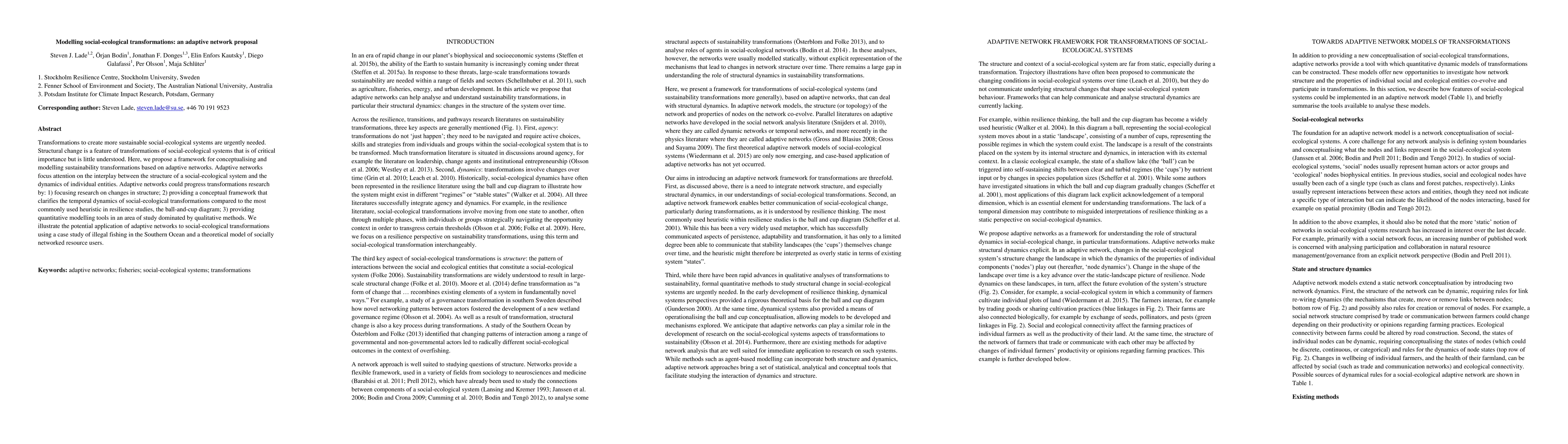 Transformations to create more sustainable social-ecological systems are urgently needed. Structural change is a feature of transformations of social-ecological systems that is of critical importance but is little understood. Here, we propose a framework for conceptualising and modelling sustainability transformations based on adaptive networks. Adaptive networks focus attention on the interplay between the structure of a social-ecological system and the dynamics of individual entities. Adaptive networks could progress transformations research by: 1) focusing research on changes in structure; 2) providing a conceptual framework that clarifies the temporal dynamics of social-ecological transformations compared to the most commonly used heuristic in resilience studies, the ball-and-cup diagram; 3) providing quantitative modelling tools in an area of study dominated by qualitative methods. We illustrate the potential application of adaptive networks to social-ecological transformations using a case study of illegal fishing in the Southern Ocean and a theoretical model of socially networked resource users.