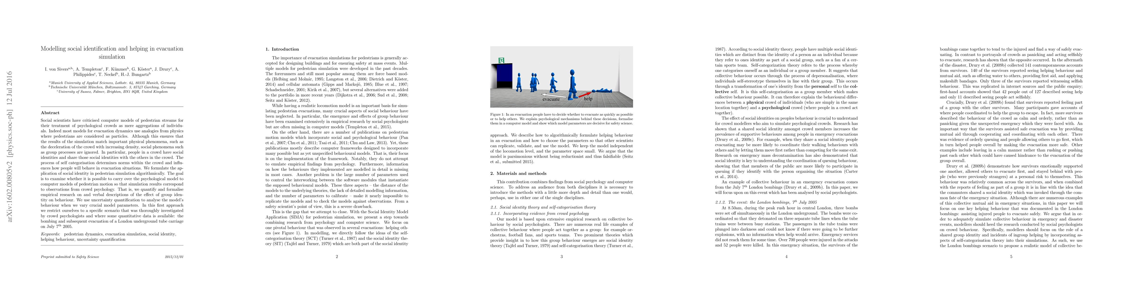 Social scientists have criticised computer models of pedestrian streams for their treatment of psychological crowds as mere aggregations of individuals. Indeed most models for evacuation dynamics use analogies from physics where pedestrians are considered as particles. Although this ensures that the results of the simulation match important physical phenomena, such as the deceleration of the crowd with increasing density, social phenomena such as group processes are ignored. In particular, people in a crowd have social identities and share those social identities with the others in the crowd. The process of self categorisation determines norms within the crowd and influences how people will behave in evacuation situations. We formulate the application of social identity in pedestrian simulation algorithmically. The goal is to examine whether it is possible to carry over the psychological model to computer models of pedestrian motion so that simulation results correspond to observations from crowd psychology. That is, we quantify and formalise empirical research on and verbal descriptions of the effect of group identity on behaviour. We use uncertainty quantification to analyse the model's behaviour when we vary crucial model parameters. In this first approach we restrict ourselves to a specific scenario that was thoroughly investigated by crowd psychologists and where some quantitative data is available: the bombing and subsequent evacuation of a London underground tube carriage on July 7th 2005.
