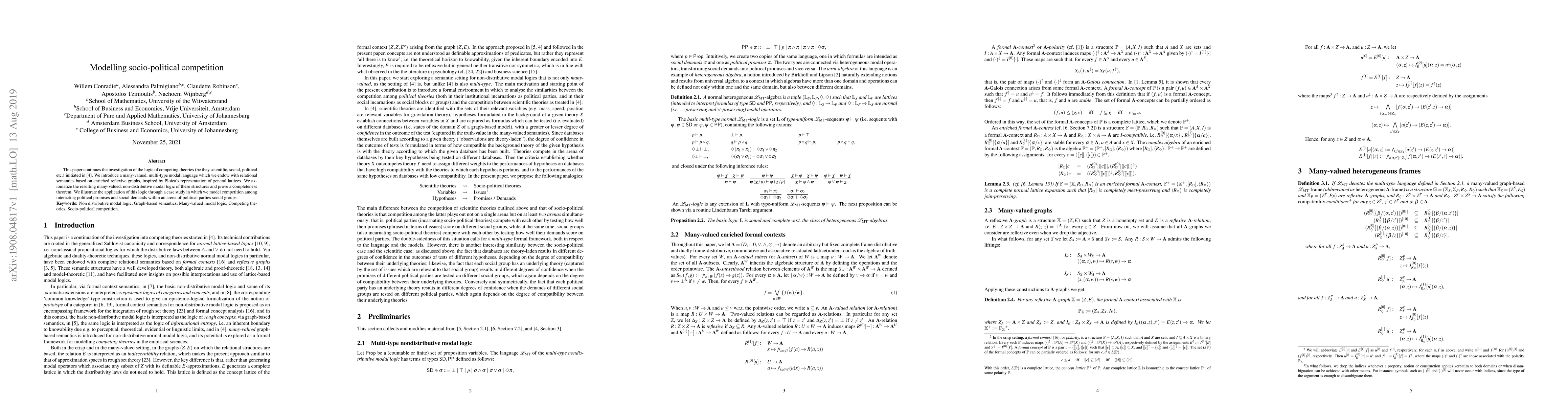 This paper continues the investigation of the logic of competing theories, be they scientific, social, political etc. We introduce a many-valued, multi-type modal language which we endow with relational semantics based on enriched reflexive graphs, inspired by Plo\v{s}\v{c}ica's representation of general lattices. We axiomatize the resulting many-valued, non-distributive modal logic of these structures and prove a completeness theorem. We illustrate the application of this logic through a case study in which we model competition among interacting political promises and social demands within an arena of political parties social groups.