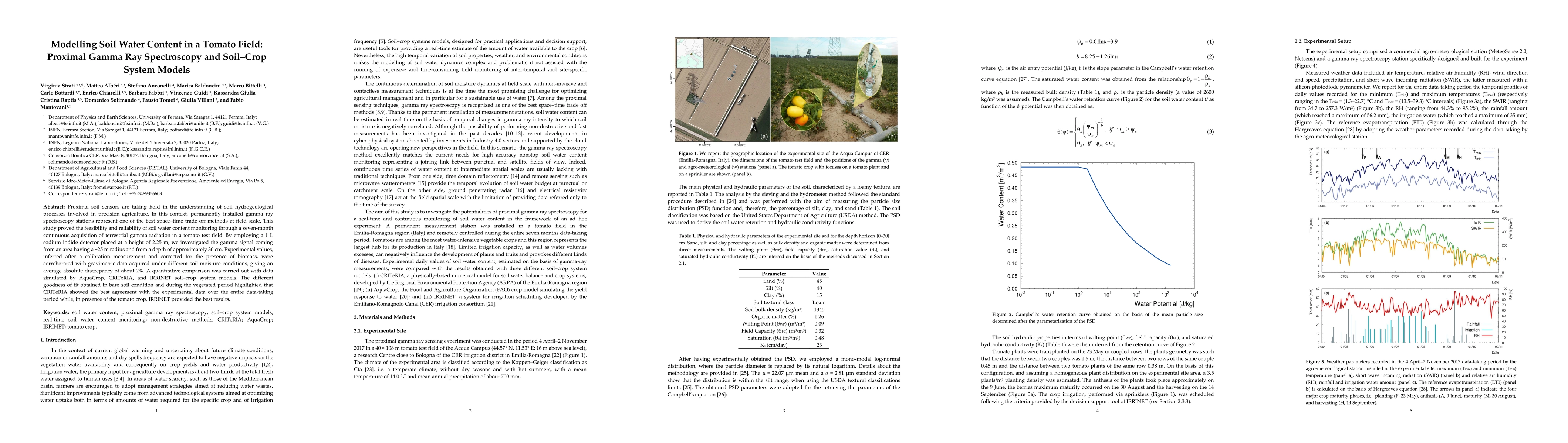 Researchers used proximal gamma ray spectroscopy to monitor soil water content in a tomato field and found a 2% average discrepancy with gravimetric data. The results were compared to three soil-crop system models, with CRITeRIA showing the best agreement under bare conditions and IRRINET under conditions with the tomato crop.