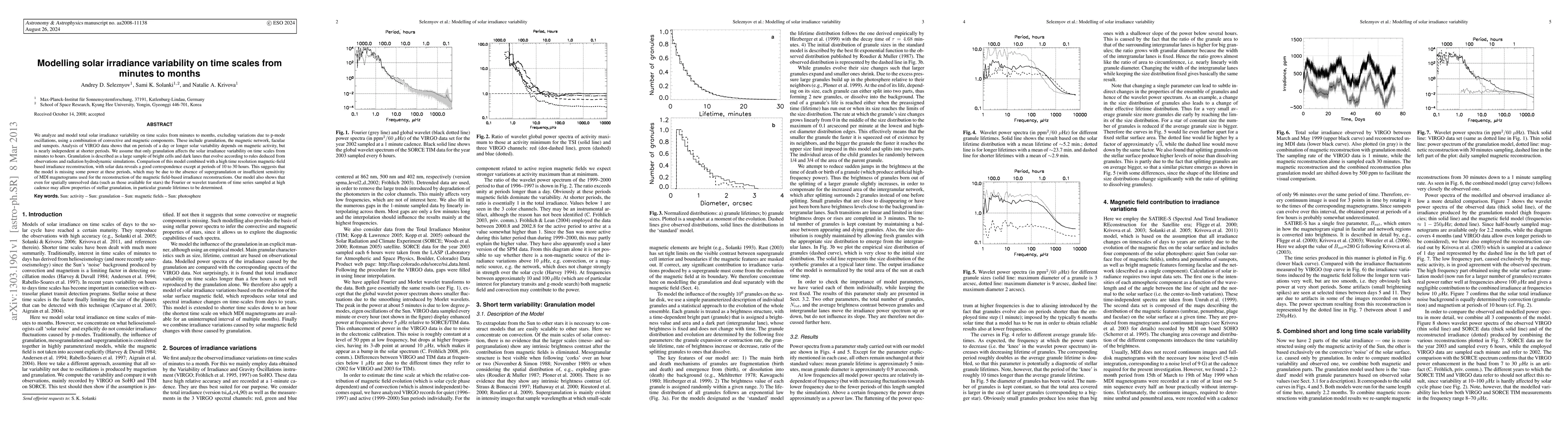 A study models solar irradiance variability on time scales from minutes to months, suggesting granulation affects short-term variability while magnetic activity impacts longer periods.