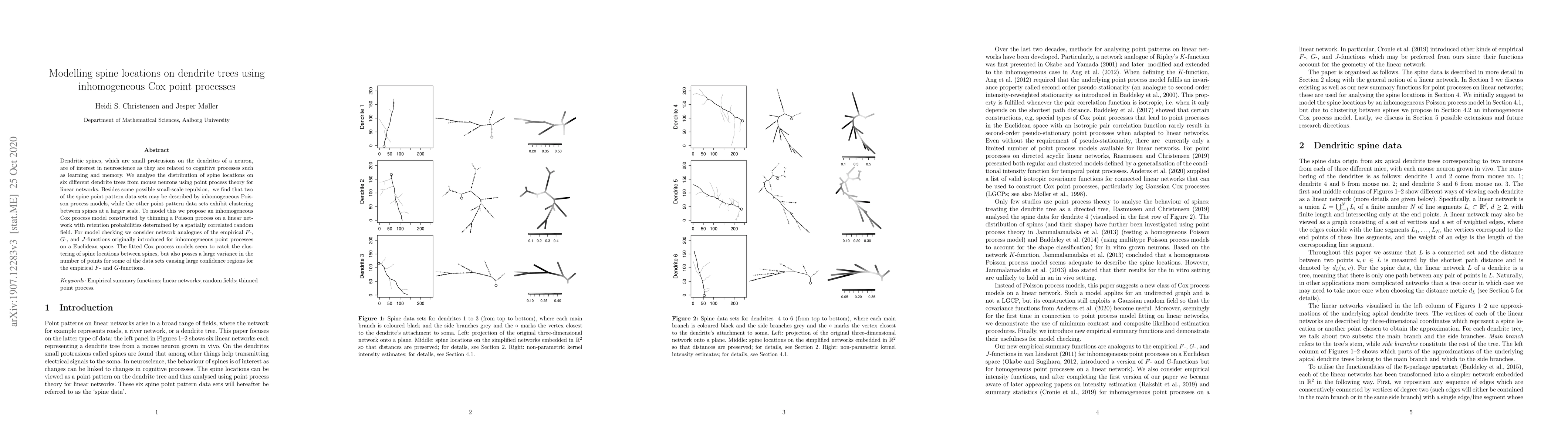 This paper models the distribution of dendritic spine locations on neuron dendrites using inhomogeneous Cox point processes, finding that two datasets fit inhomogeneous Poisson processes while others show clustering, which is better captured by the proposed Cox process model. The model's performance is evaluated using network analogues of empirical functions.