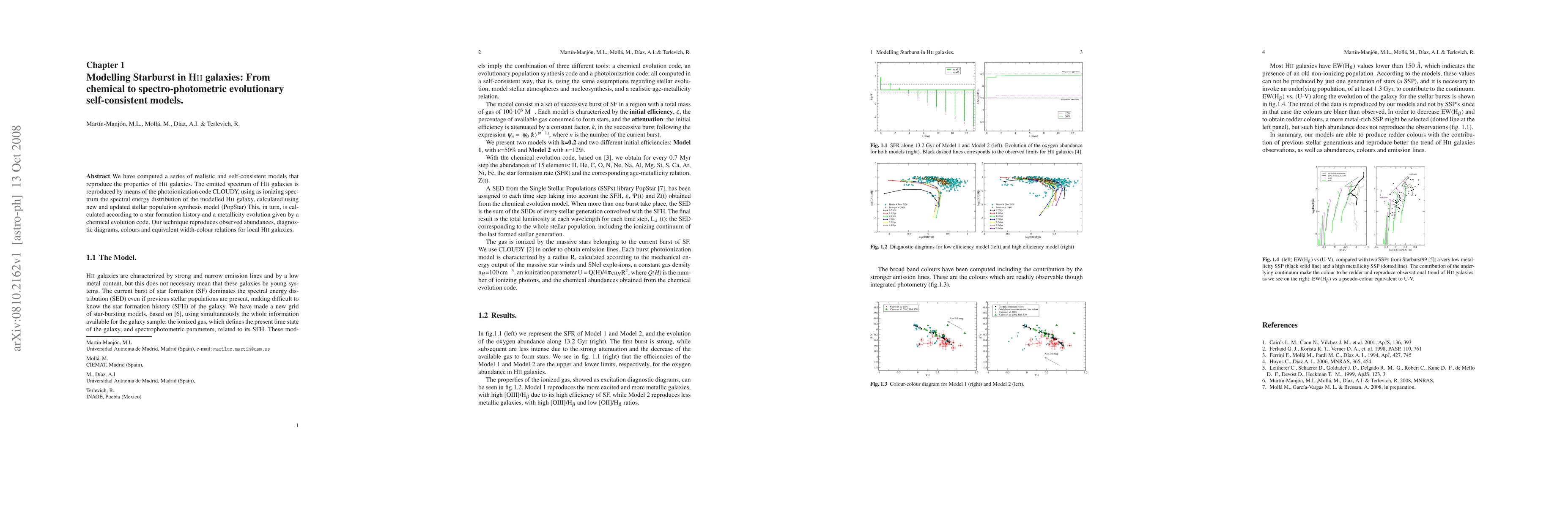 We have computed a series of realistic and self-consistent models that reproduce the properties of HII galaxies. The emitted spectrum of HII galaxies is reproduced by means of the photoionization code CLOUDY, using as ionizing spectrum the spectral energy distribution of the modelled HII galaxy, calculated using new and updated stellar population synthesis model (PopStar, Molla et al. 08) This, in turn, is calculated according to a star formation history and a metallicity evolution given by a chemical evolution code. Our technique reproduces observed abundances, diagnostic diagrams, colours and equivalent width vs. colour relations for local HII galaxies