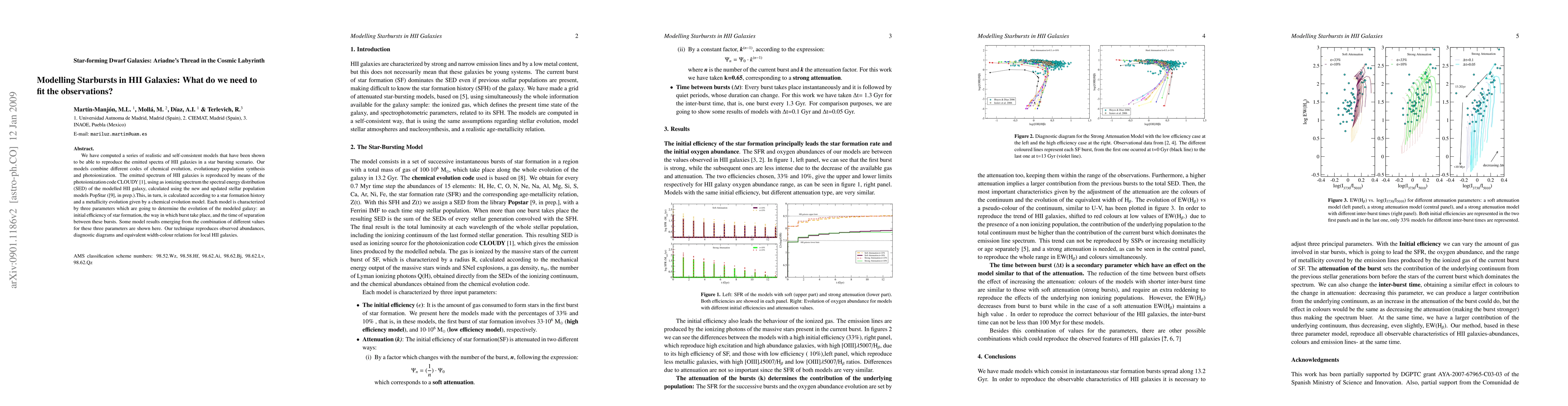 This paper presents a modeling technique for starbursting HII galaxies using self-consistent models combining chemical evolution, population synthesis, and photoionization codes. The technique reproduces observed abundances, diagnostic diagrams, and equivalent width-color relations for local HII galaxies, demonstrating its effectiveness in simulating these celestial objects.