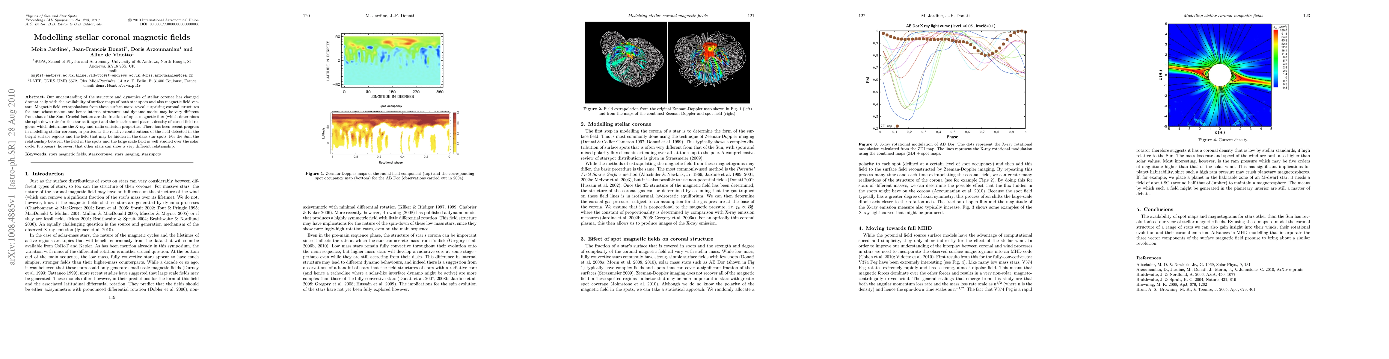 This paper explores the modelling of stellar coronal magnetic fields, highlighting the differences in coronal structures and magnetic field dynamics across stars compared to the Sun. It emphasizes the importance of open magnetic flux and closed-field regions in determining stellar emission properties and discusses the varying relationships between magnetic fields in star spots and the large-scale field among different stars.