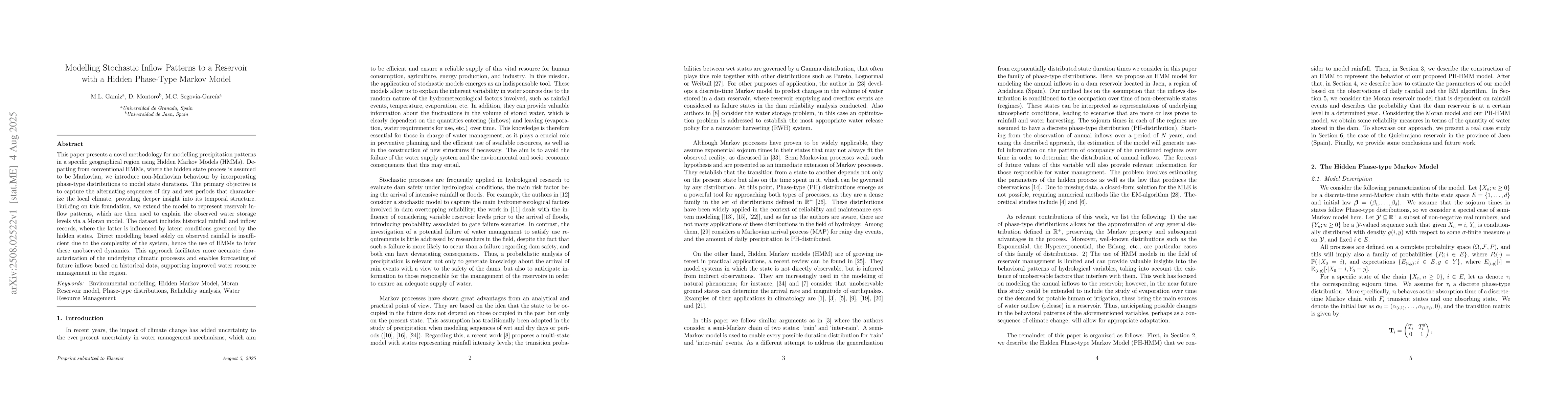 This paper presents a novel methodology for modelling precipitation patterns in a specific geographical region using Hidden Markov Models (HMMs). Departing from conventional HMMs, where the hidden state process is assumed to be Markovian, we introduce non-Markovian behaviour by incorporating phase-type distributions to model state durations. The primary objective is to capture the alternating sequences of dry and wet periods that characterize the local climate, providing deeper insight into its temporal structure. Building on this foundation, we extend the model to represent reservoir inflow patterns, which are then used to explain the observed water storage levels via a Moran model. The dataset includes historical rainfall and inflow records, where the latter is influenced by latent conditions governed by the hidden states. Direct modelling based solely on observed rainfall is insufficient due to the complexity of the system, hence the use of HMMs to infer these unobserved dynamics. This approach facilitates more accurate characterization of the underlying climatic processes and enables forecasting of future inflows based on historical data, supporting improved water resource management in the region.