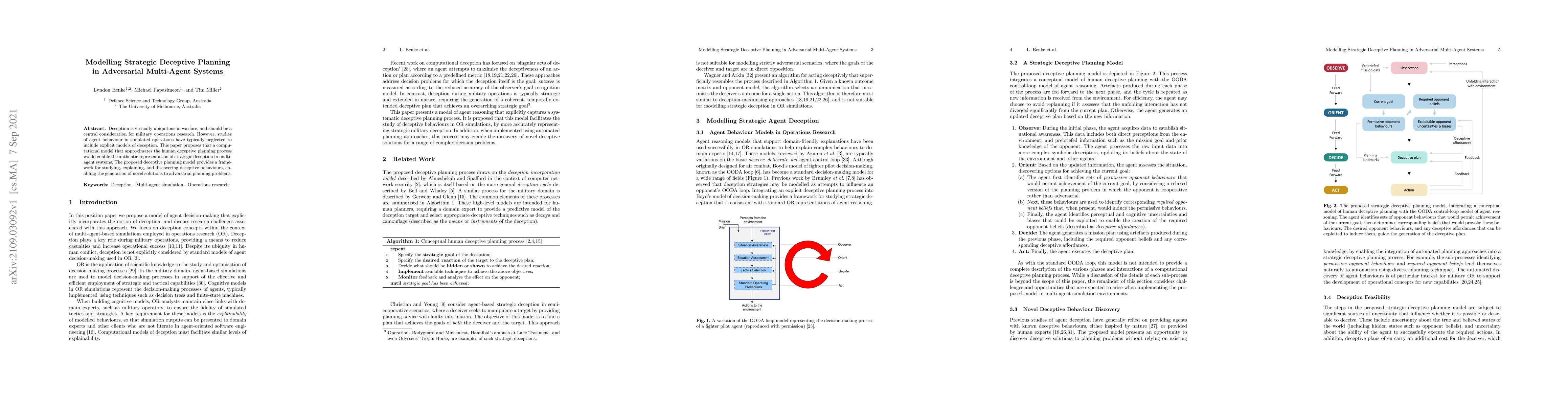 Deception is virtually ubiquitous in warfare, and should be a central consideration for military operations research. However, studies of agent behaviour in simulated operations have typically neglected to include explicit models of deception. This paper proposes that a computational model that approximates the human deceptive planning process would enable the authentic representation of strategic deception in multi-agent systems. The proposed deceptive planning model provides a framework for studying, explaining, and discovering deceptive behaviours, enabling the generation of novel solutions to adversarial planning problems.