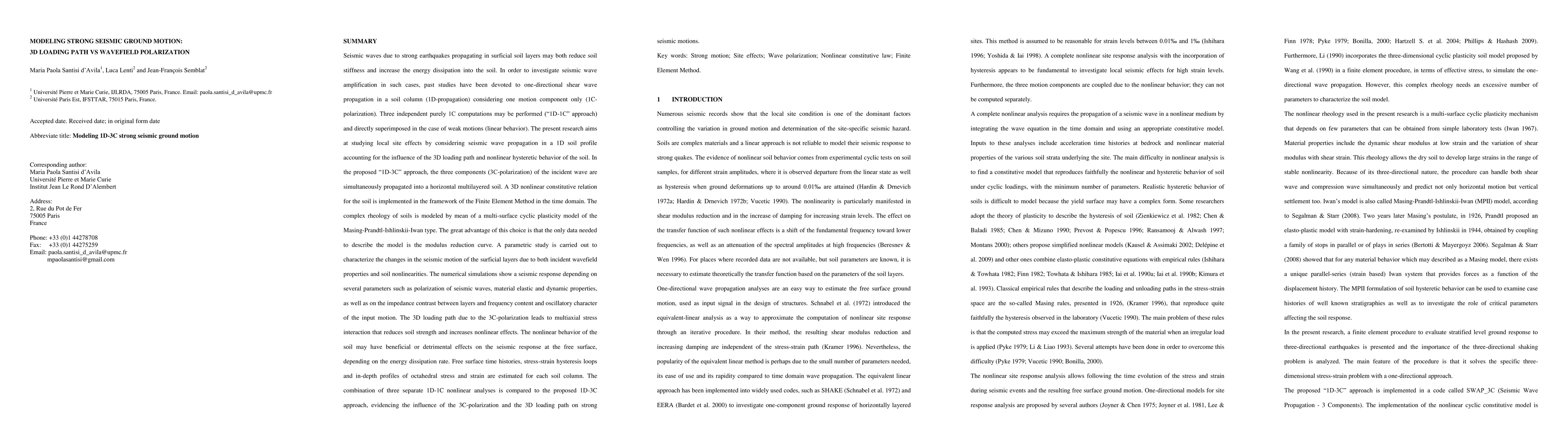 Seismic waves due to strong earthquakes propagating in surficial soil layers may both reduce soil stiffness and increase the energy dissipation into the soil. To investigate seismic wave amplification in such cases, past studies have been devoted to one-directional shear wave propagation in a soil column (1D-propagation) considering one motion component only (1C-polarization). Three independent purely 1C computations may be performed ('1D-1C' approach) and directly superimposed in the case of weak motions (linear behaviour). This research aims at studying local site effects by considering seismic wave propagation in a 1-D soil profile accounting for the influence of the 3-D loading path and non-linear hysteretic behaviour of the soil. In the proposed '1D-3C' approach, the three components (3C-polarization) of the incident wave are simultaneously propagated into a horizontal multilayered soil. A 3-D non-linear constitutive relation for the soil is implemented in the framework of the Finite Element Method in the time domain. The complex rheology of soils is modelled by mean of a multisurface cyclic plasticity model of the Masing-Prandtl-Ishlinskii-Iwan type. The great advantage of this choice is that the only data needed to describe the model is the modulus reduction curve. A parametric study is carried out to characterize the changes in the seismic motion of the surficial layers due to both incident wavefield properties and soil non-linearities. The numerical simulations show a seismic response depending on several parameters such as polarization of seismic waves, material elastic and dynamic properties, as well as on the impedance contrast between layers and frequency content and oscillatory character of the input motion. The 3-D loading path due to the 3C-polarization leads to multi-axial stress interaction that reduces soil strength and increases non-linear effects. The non-linear behaviour of the soil may have beneficial or detrimental effects on the seismic response at the free surface, depending on the energy dissipation rate. Free surface time histories, stress-strain hysteresis loops and in-depth profiles of octahedral stress and strain are estimated for each soil column. The combination of three separate 1D-1C non-linear analyses is compared to the proposed 1D-3C approach, evidencing the influence of the 3C-polarization and the 3-D loading path on strong seismic motions.