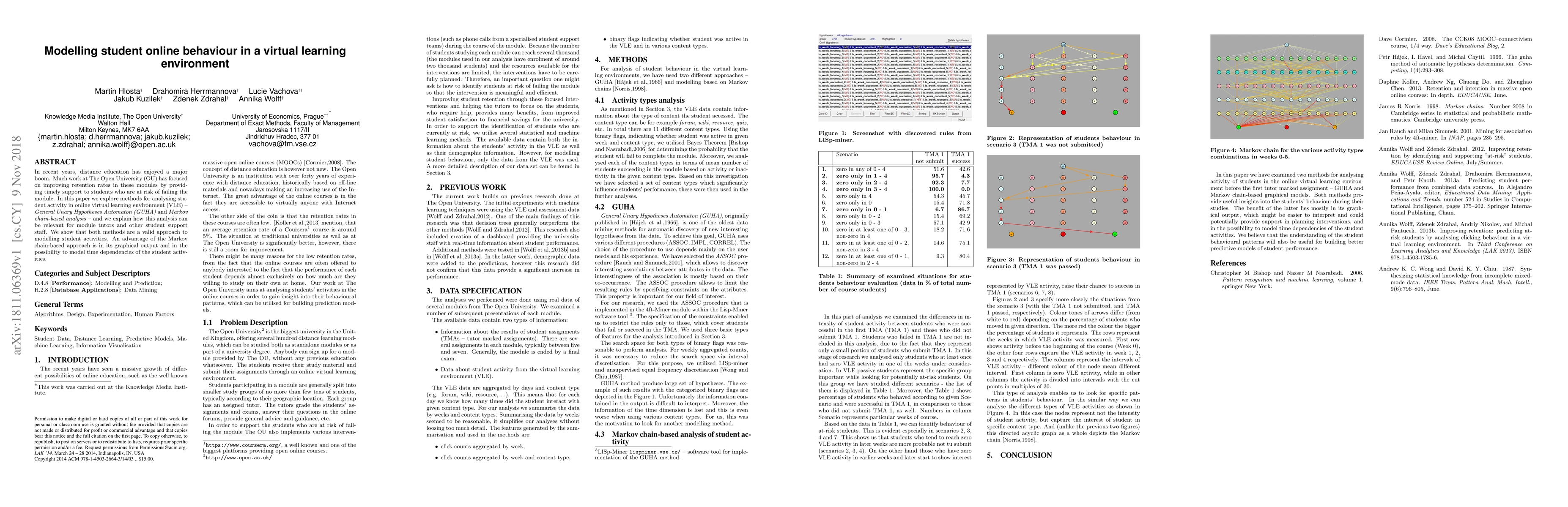 In recent years, distance education has enjoyed a major boom. Much work at The Open University (OU) has focused on improving retention rates in these modules by providing timely support to students who are at risk of failing the module. In this paper we explore methods for analysing student activity in online virtual learning environment (VLE) -- General Unary Hypotheses Automaton (GUHA) and Markov chain-based analysis -- and we explain how this analysis can be relevant for module tutors and other student support staff. We show that both methods are a valid approach to modelling student activities. An advantage of the Markov chain-based approach is in its graphical output and in the possibility to model time dependencies of the student activities.