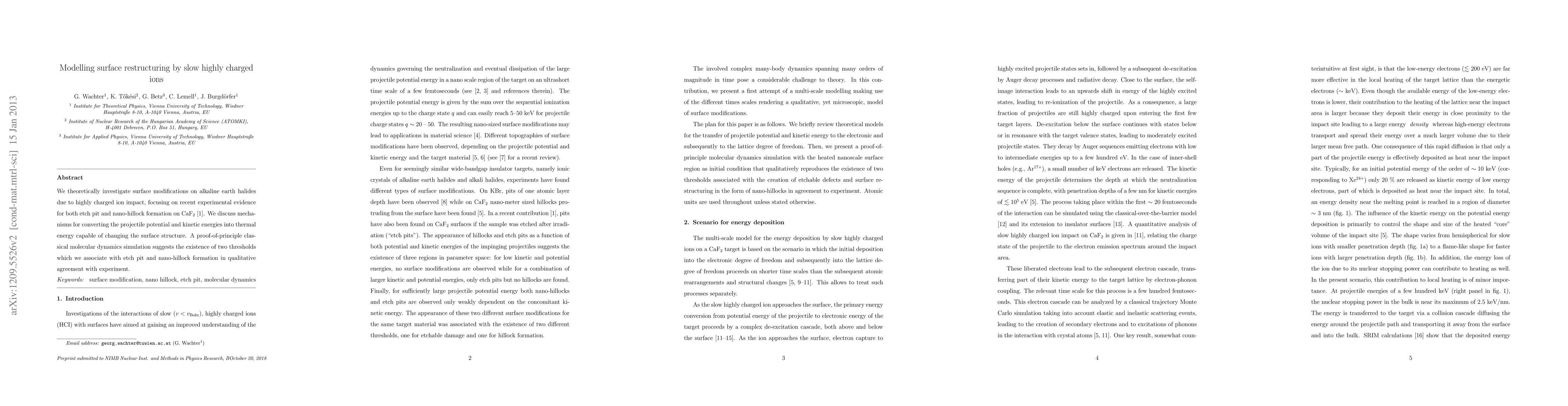 This paper theoretically investigates surface restructuring on alkaline earth halides caused by highly charged ion impacts, focusing on the formation of etch pits and nano-hillocks on CaF2. Classical molecular dynamics simulations reveal two thresholds linked to these surface modifications, aligning qualitatively with experimental observations.