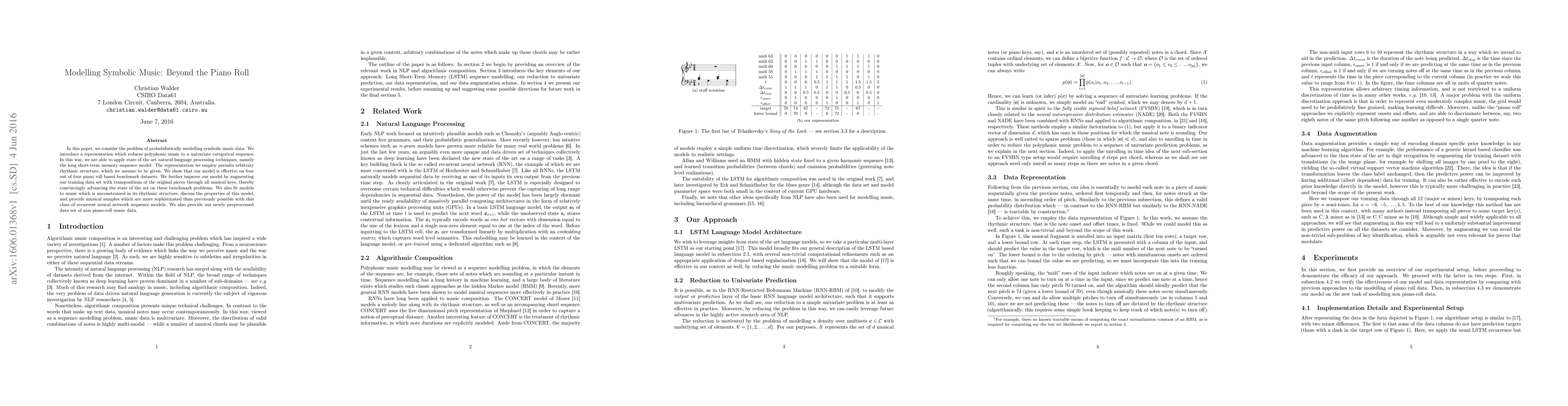In this paper, we consider the problem of probabilistically modelling symbolic music data. We introduce a representation which reduces polyphonic music to a univariate categorical sequence. In this way, we are able to apply state of the art natural language processing techniques, namely the long short-term memory sequence model. The representation we employ permits arbitrary rhythmic structure, which we assume to be given. We show that our model is effective on four out of four piano roll based benchmark datasets. We further improve our model by augmenting our training data set with transpositions of the original pieces through all musical keys, thereby convincingly advancing the state of the art on these benchmark problems. We also fit models to music which is unconstrained in its rhythmic structure, discuss the properties of this model, and provide musical samples which are more sophisticated than previously possible with this class of recurrent neural network sequence models. We also provide our newly preprocessed data set of non piano-roll music data.