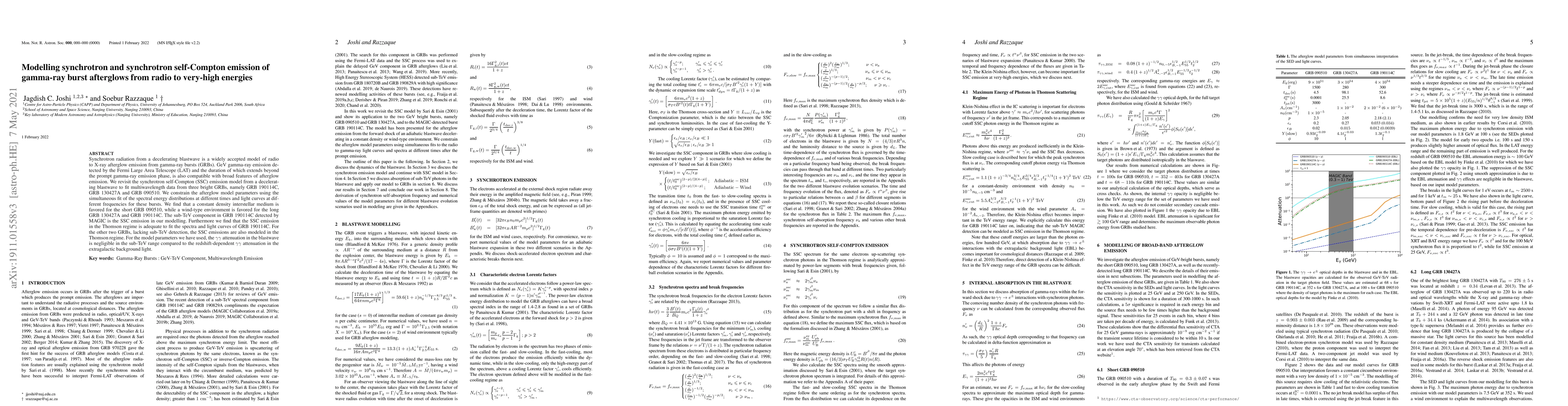 Researchers model synchrotron and synchrotron self-Compton emission in gamma-ray burst afterglows, finding that a constant density interstellar medium is favored for one GRB and a wind-type environment for another, with Thomson regime SSC emissions consistent across multiple bursts.